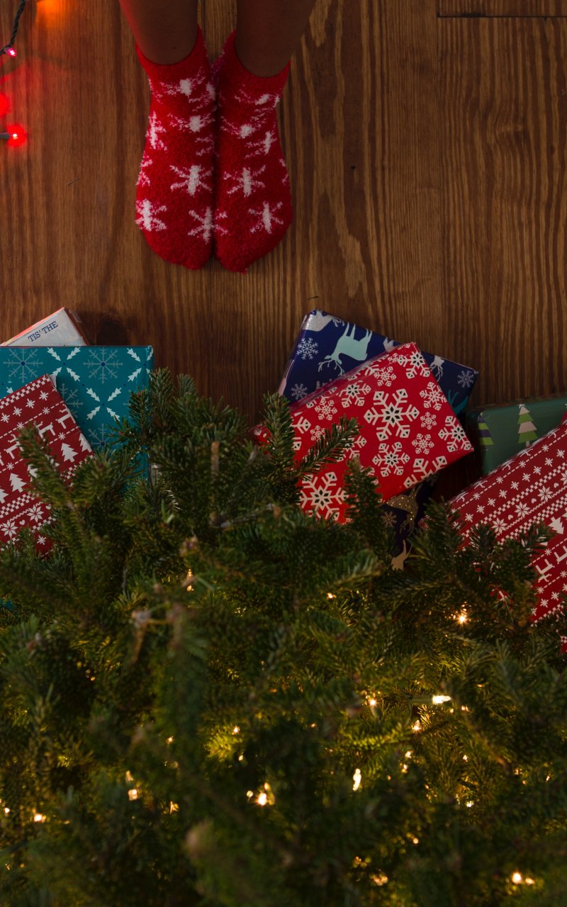 Wallpaper: gifts, Christmas tree, holidays, feet, socks, bright light bulbs - 800x1280