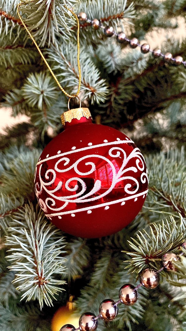 Wallpaper: spruce, christmas toy, needles, pattern, red - 750x1334