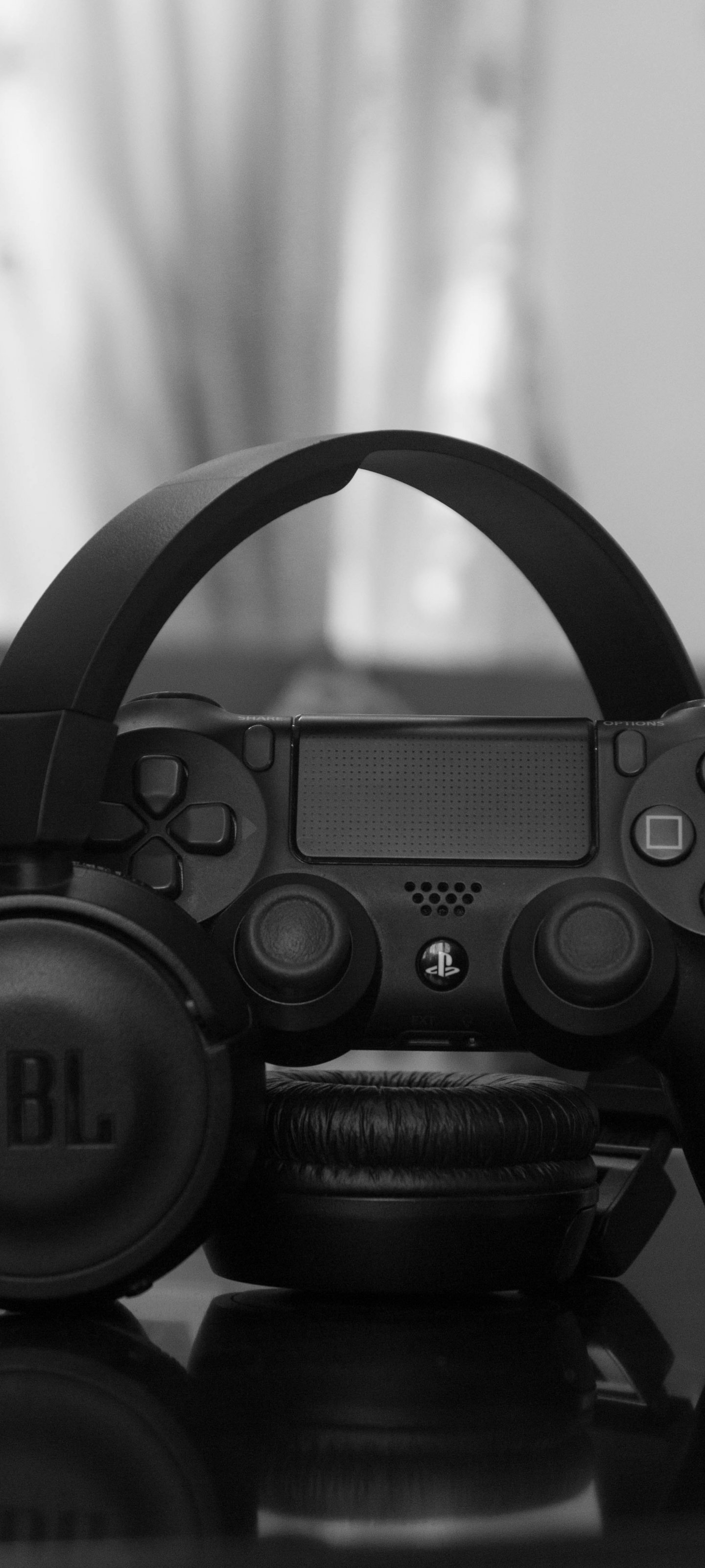Wallpaper: headphone, joystick, game, black and white photo, music - 1440x3200