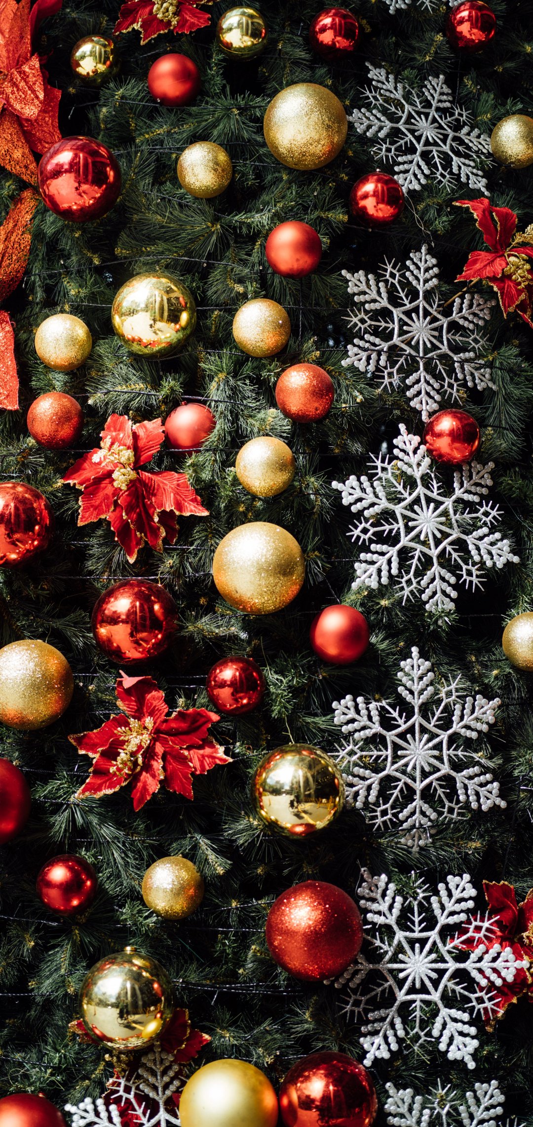 Wallpaper: christmas tree decorations, snowflakes, red, golden, balls, mood, holiday, happiness - 1080x2280