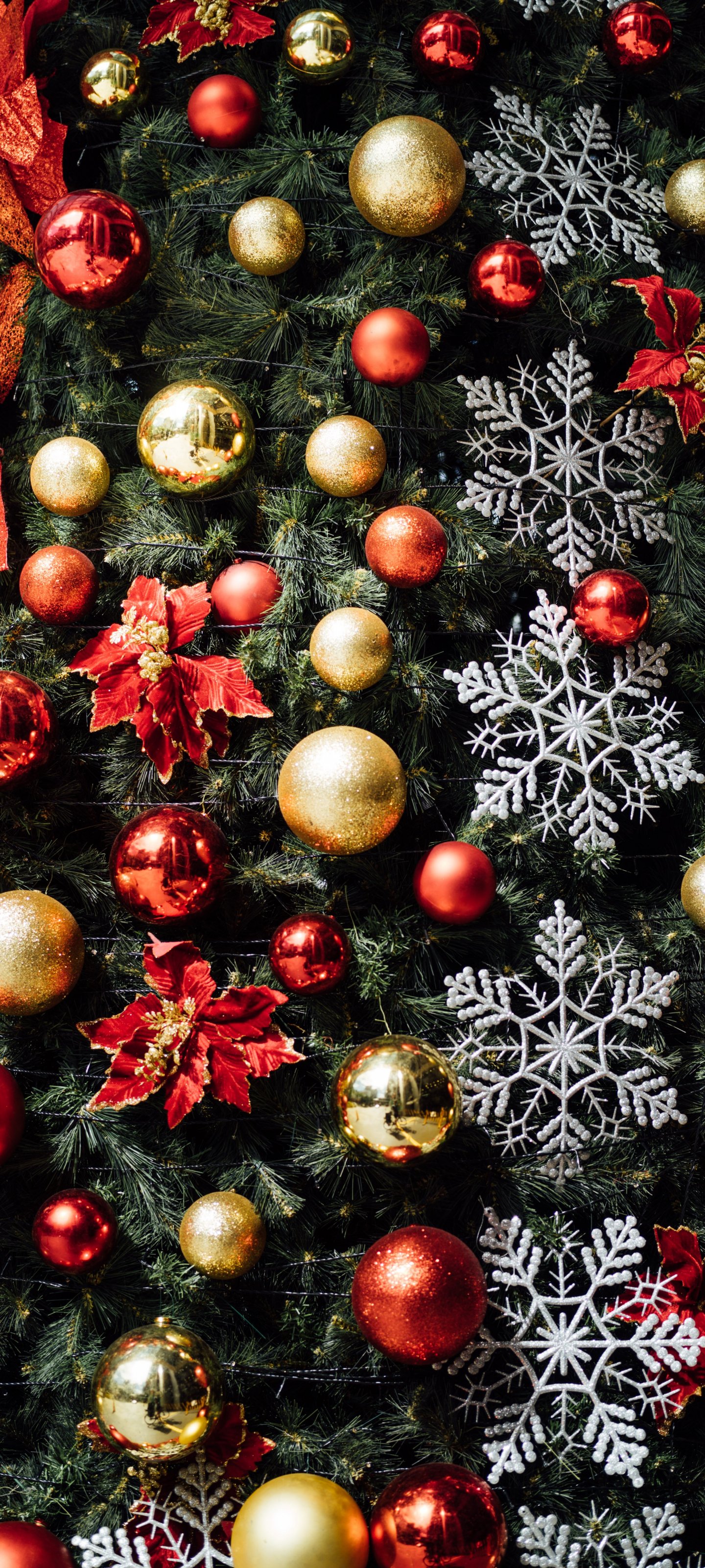 Wallpaper: christmas tree decorations, snowflakes, red, golden, balls, mood, holiday, happiness - 1440x3200