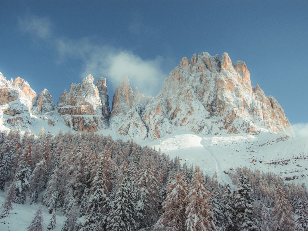 Wallpaper: mountains, snowy hills, trees, snow, path, winter - 1024x768