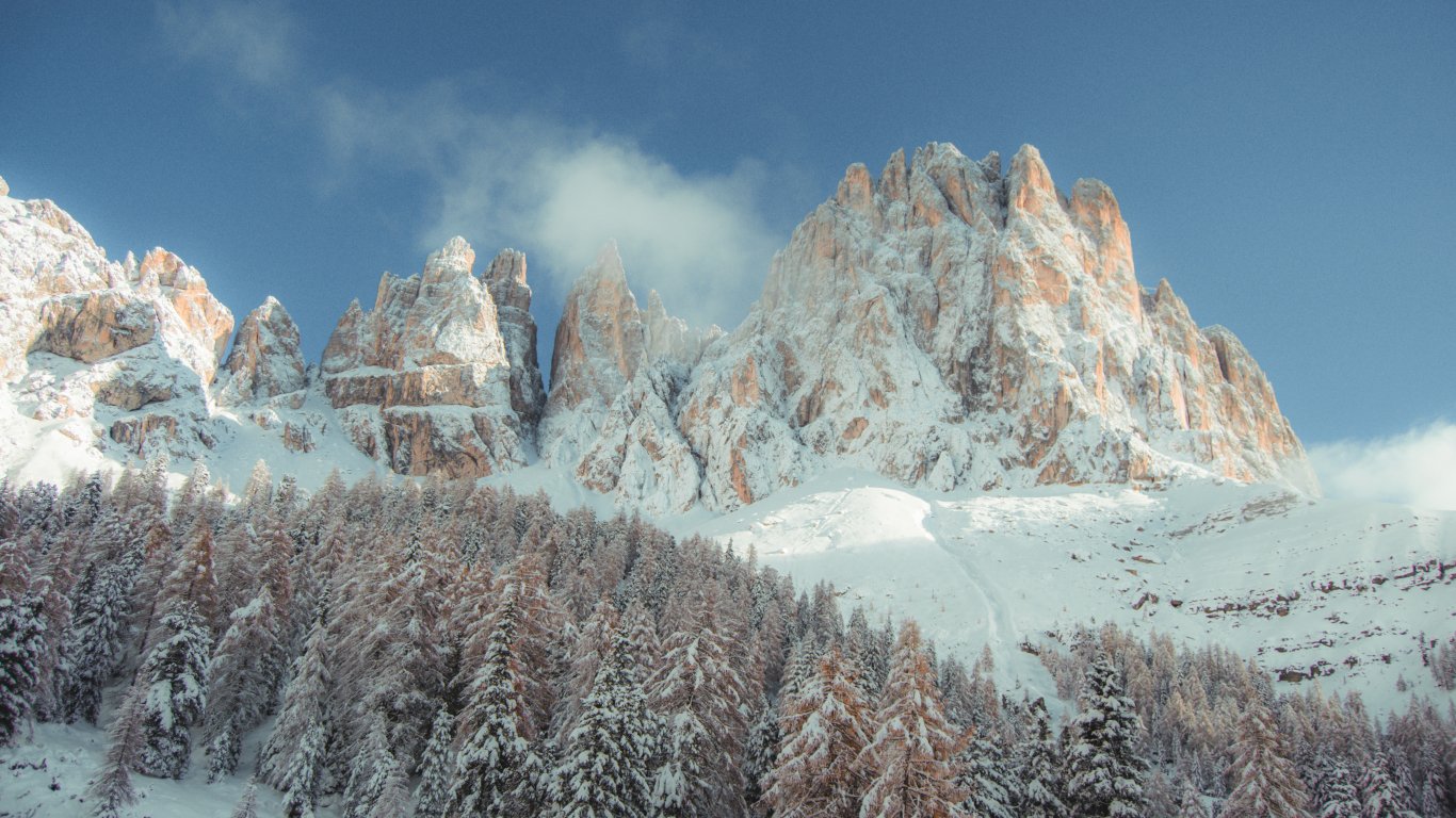 Wallpaper: mountains, snowy hills, trees, snow, path, winter - 1366x768