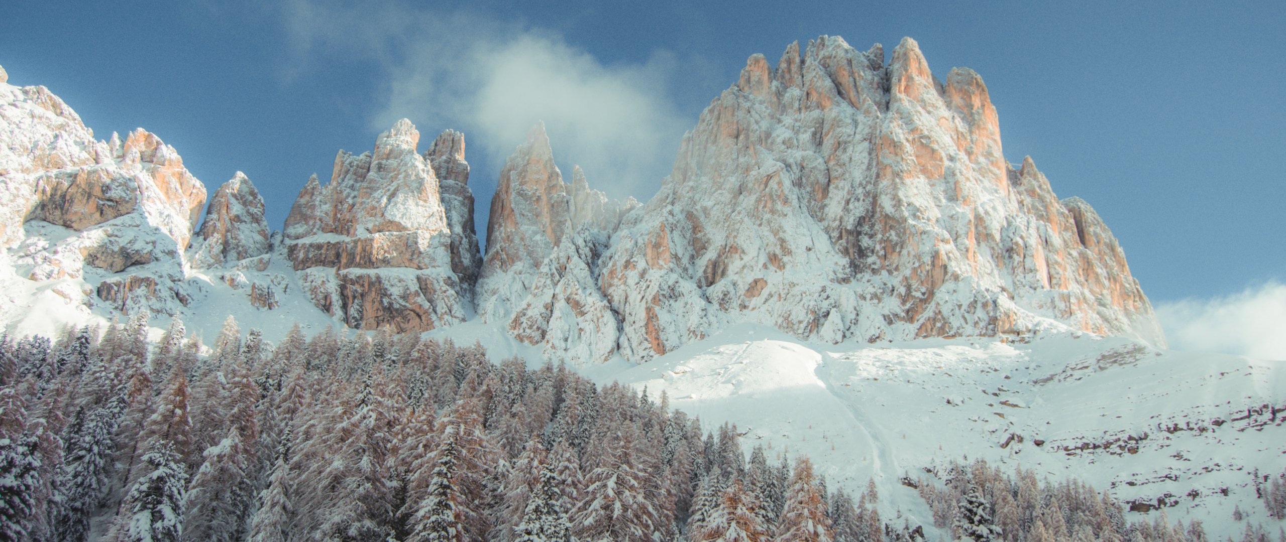 Wallpaper: mountains, snowy hills, trees, snow, path, winter - 2560x1080