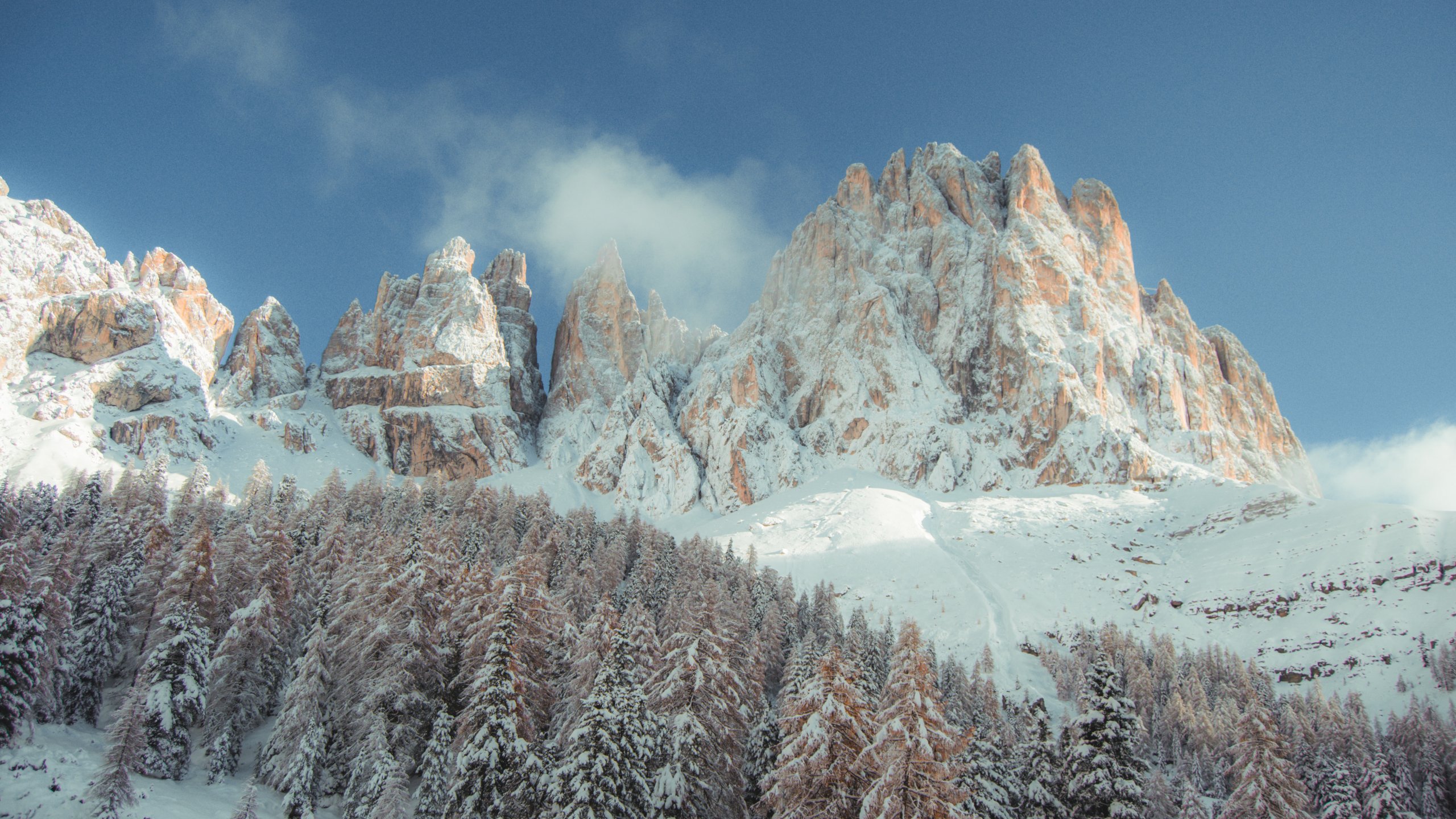 Wallpaper: mountains, snowy hills, trees, snow, path, winter - 2560x1440