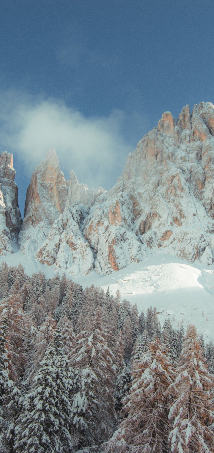 mountain, peak, forest, snow, trees, calm, pacification Wallpaper 720x1520