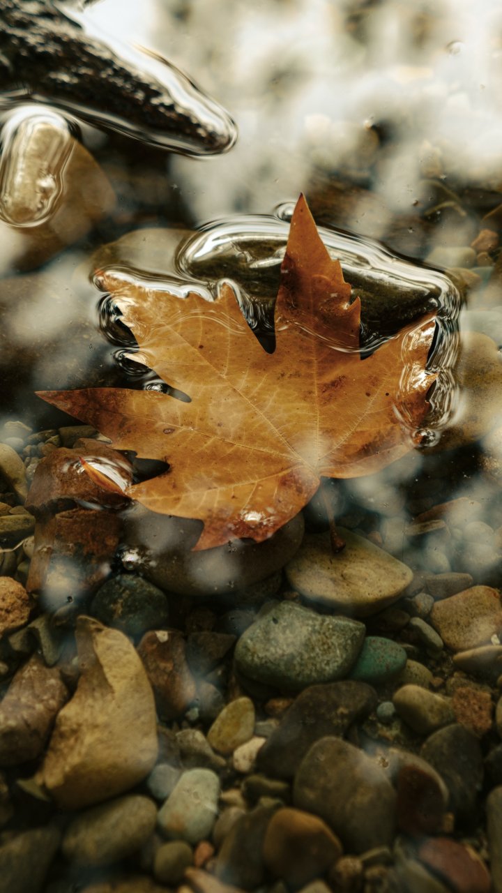 Wallpaper: maple leaf, sheet, yellow leaf, autumn, puddle, water, stones - 720x1280