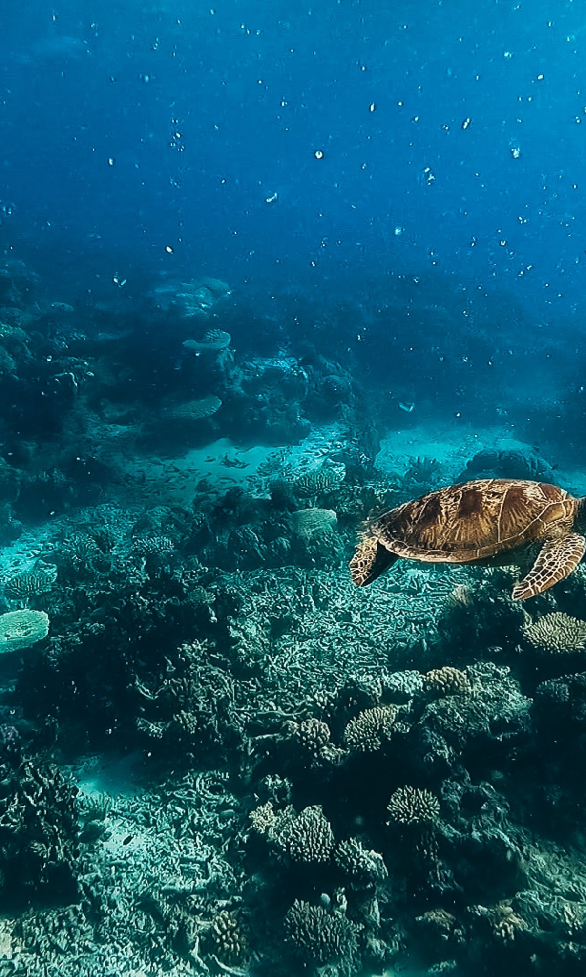 Wallpaper: turtle, underwater world, scuba diver, water, depth, coral - 1200x2000
