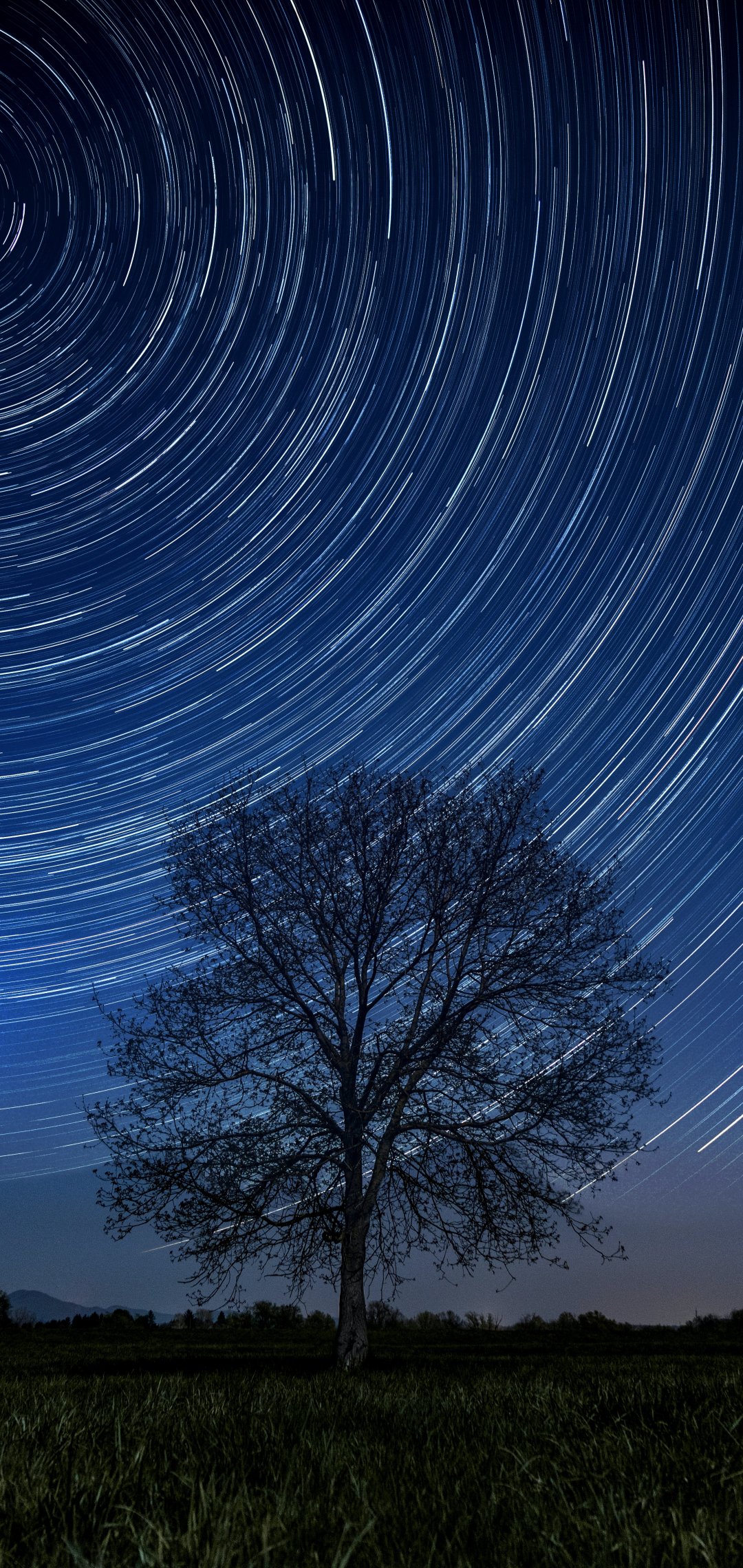 Wallpaper: tree, night, stars, long exposure, grass - 1080x2280