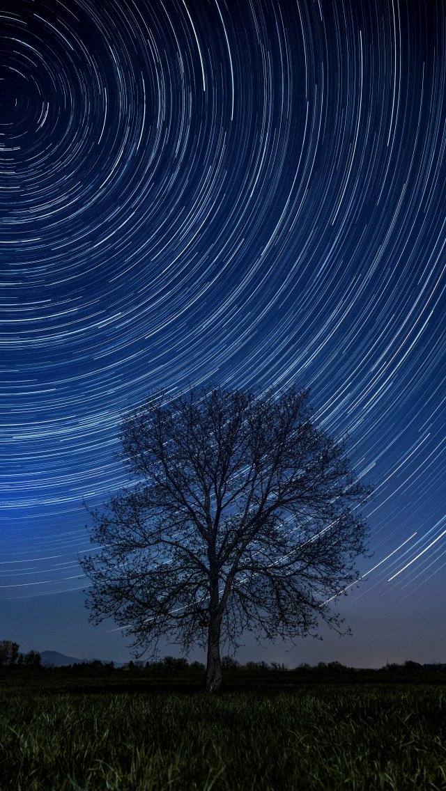 Wallpaper: tree, night, stars, long exposure, grass - 640x1136