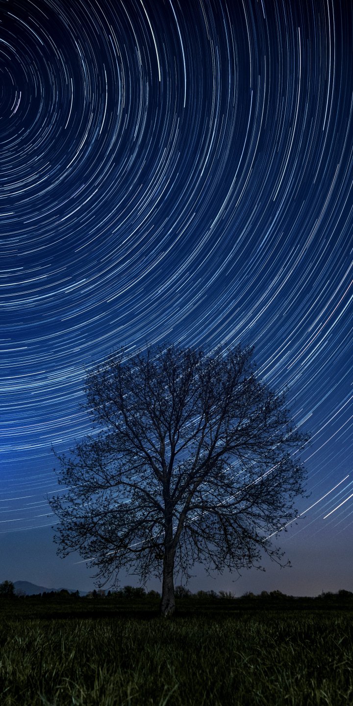 Wallpaper: tree, night, stars, long exposure, grass - 720x1440