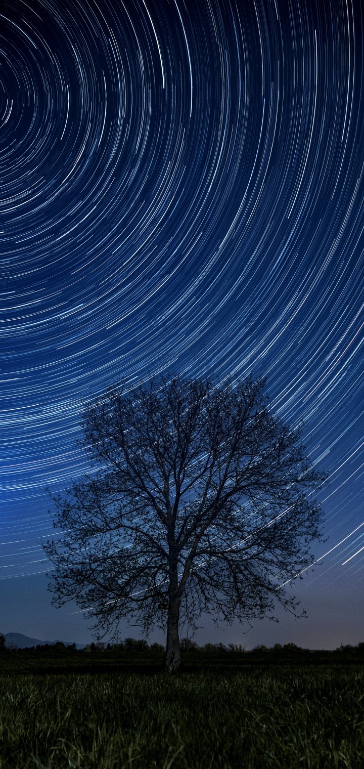 Wallpaper: tree, night, stars, long exposure, grass - 720x1520