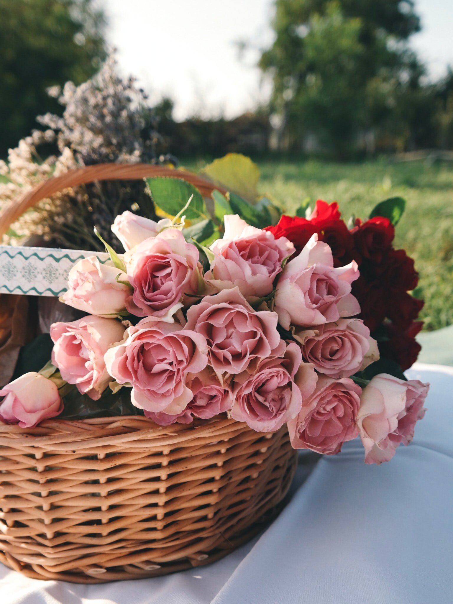 Wallpaper: flowers, cart, roses, picnic - 1536x2048