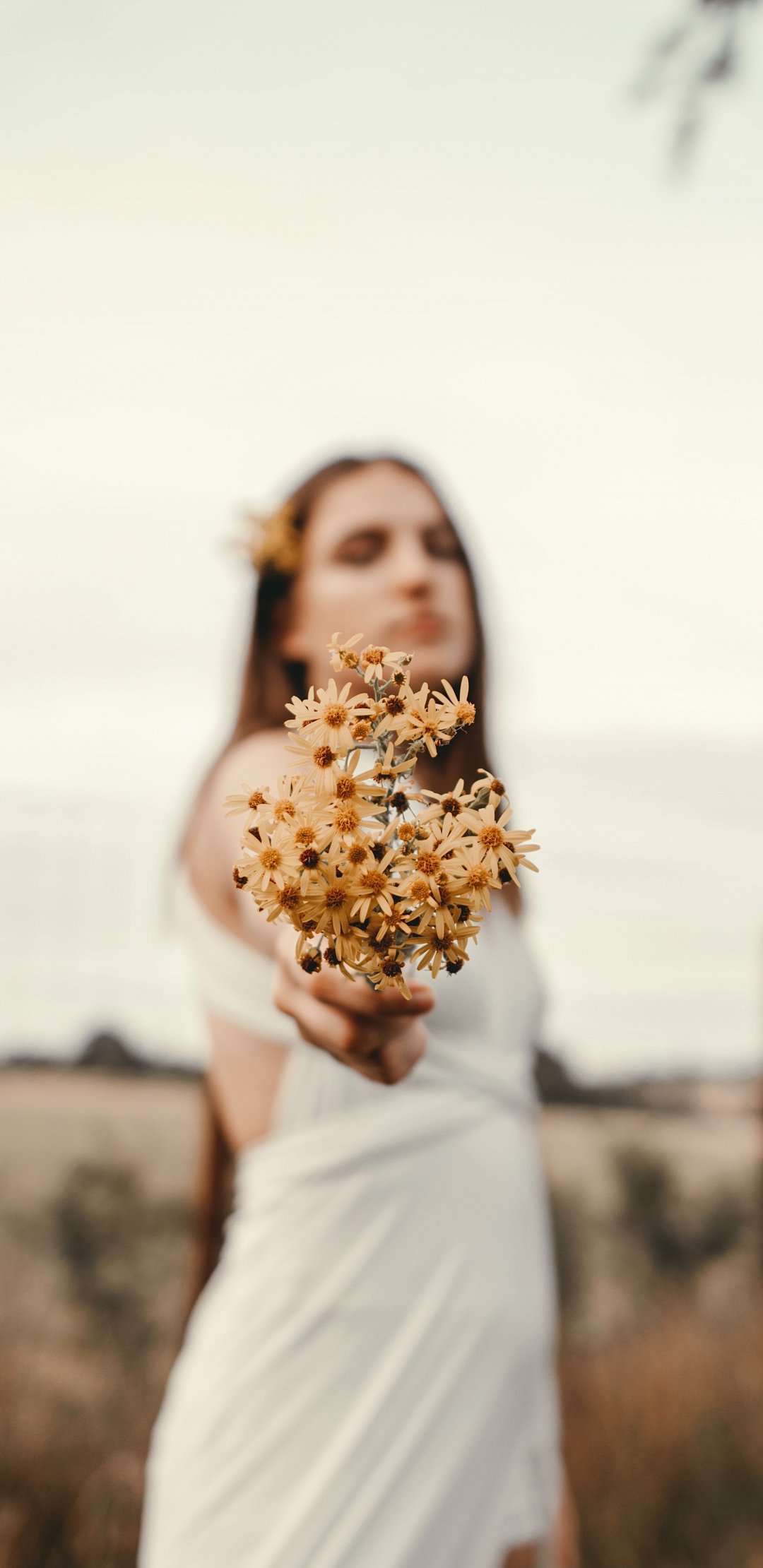 Wallpaper: girl, flowers, pole, chamomile, man - 1080x2220
