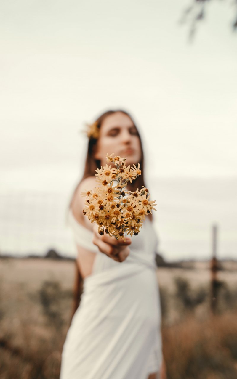 Wallpaper: girl, flowers, pole, chamomile, man - 800x1280