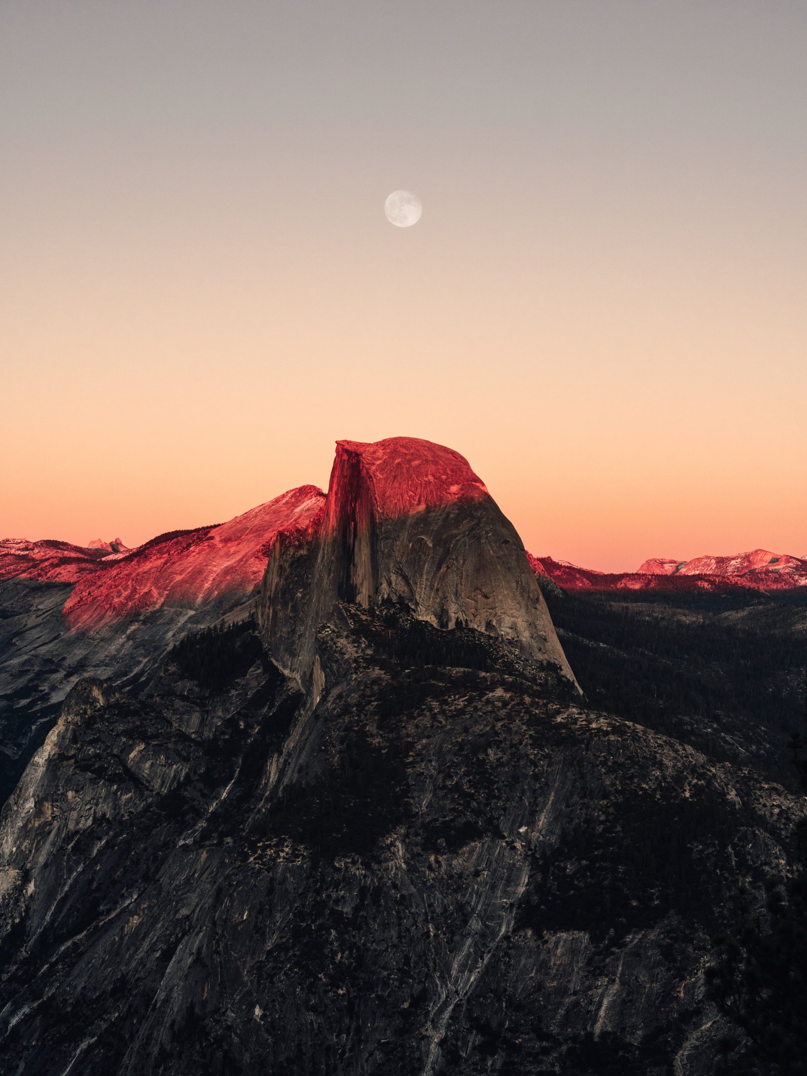 Wallpaper: sunset in the mountains, sunset, mountains, moon, rocks - 1620x2160