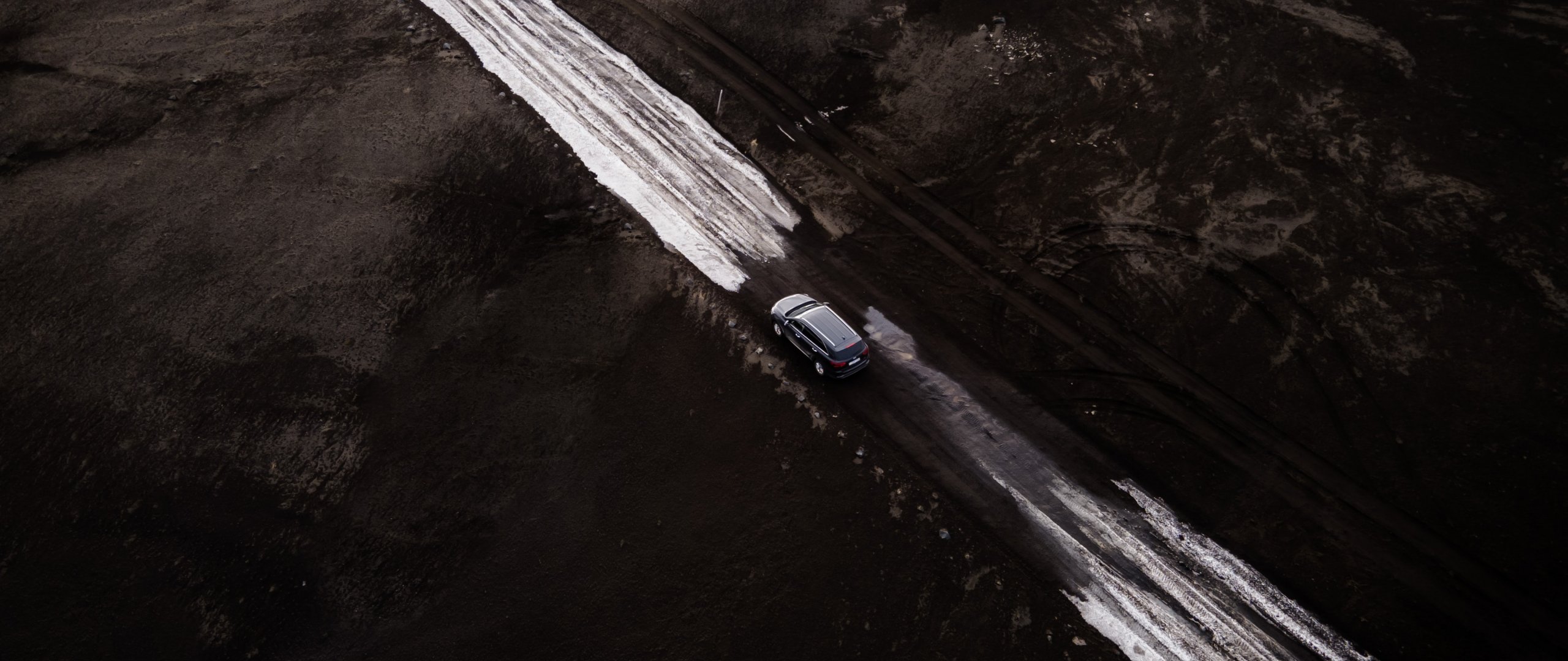 Wallpaper: road, machine, snow, top view - 2560x1080