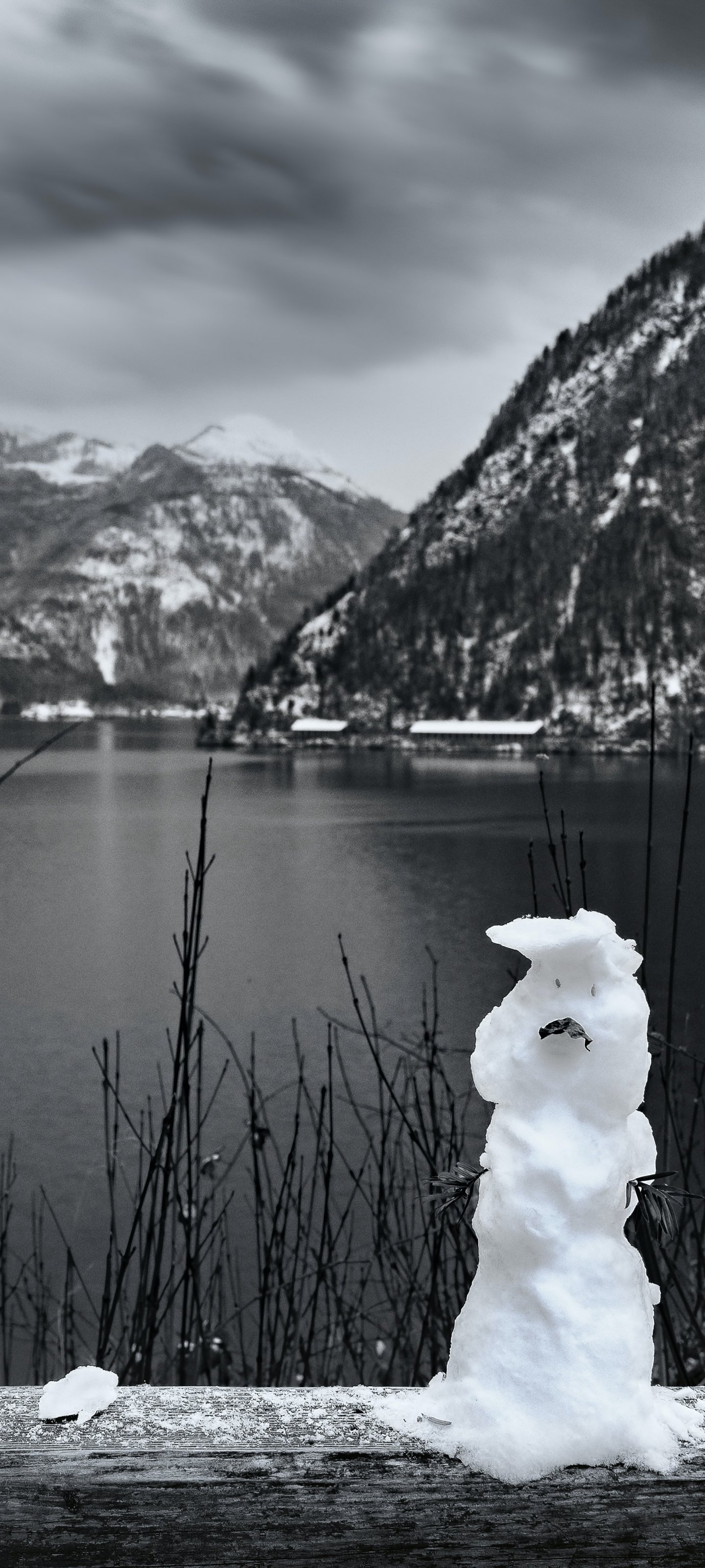 Wallpaper: mountains, lake, snowman - 1440x3200
