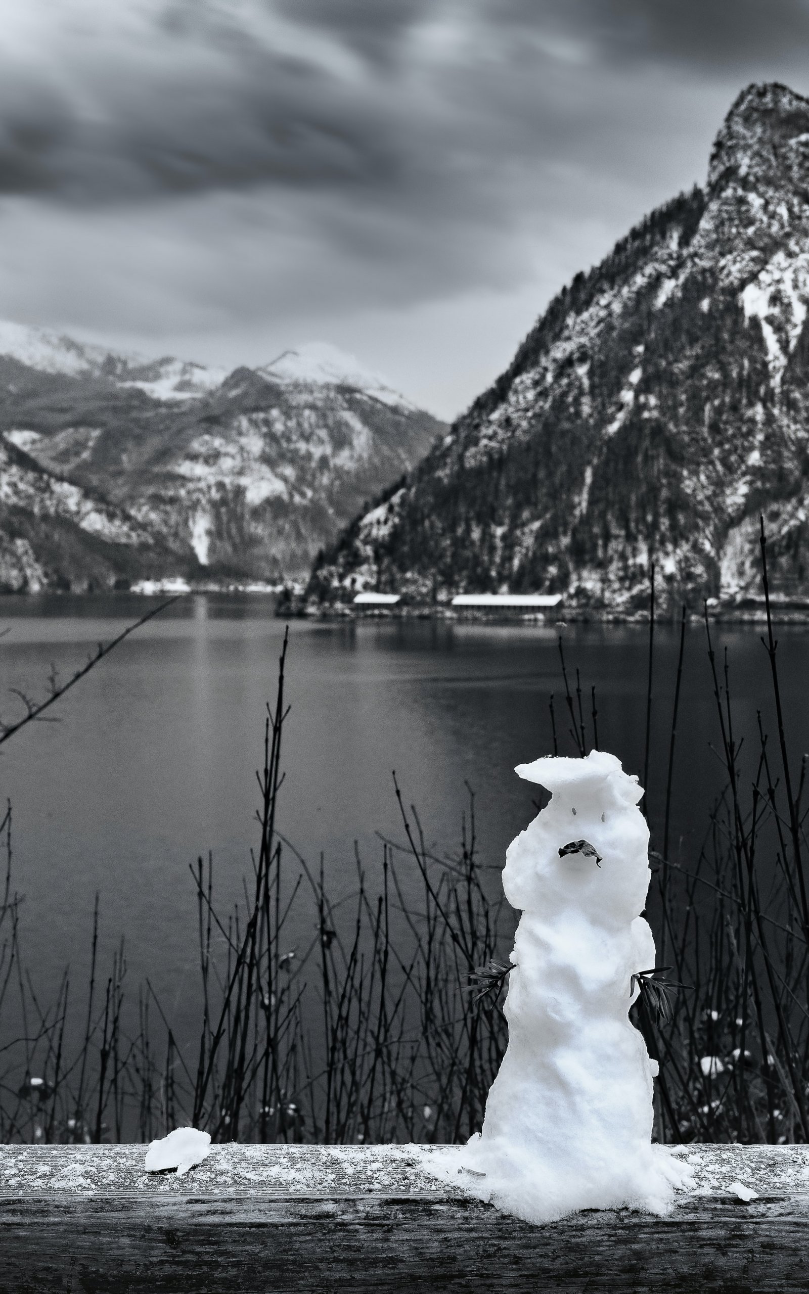 Wallpaper: mountains, lake, snowman - 1600x2560