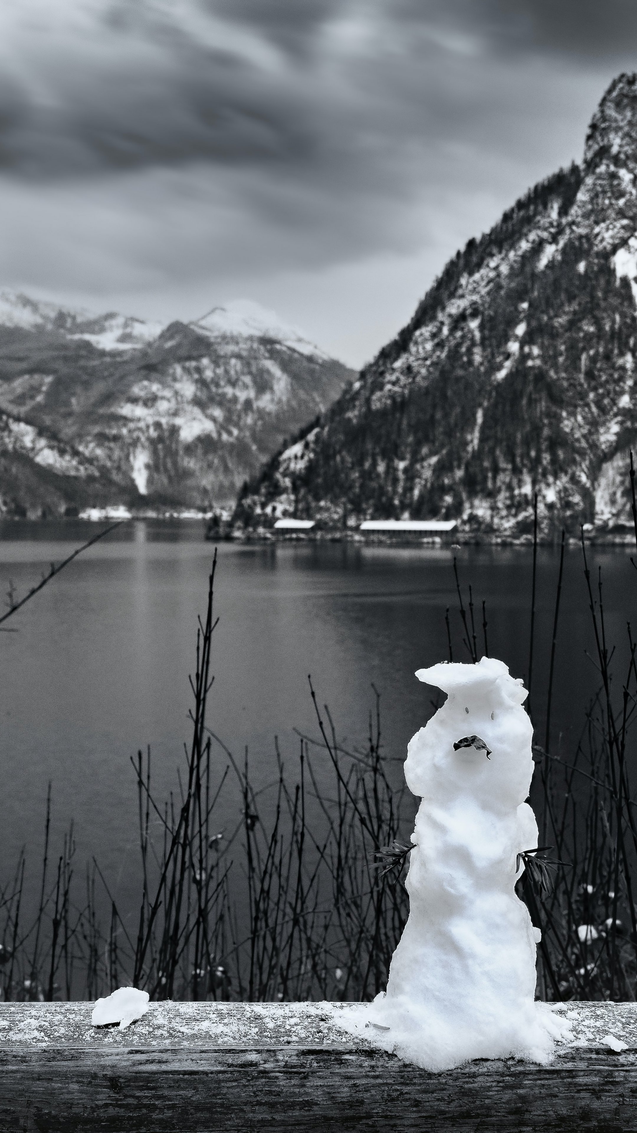 Wallpaper: mountains, lake, snowman - 2160x3840