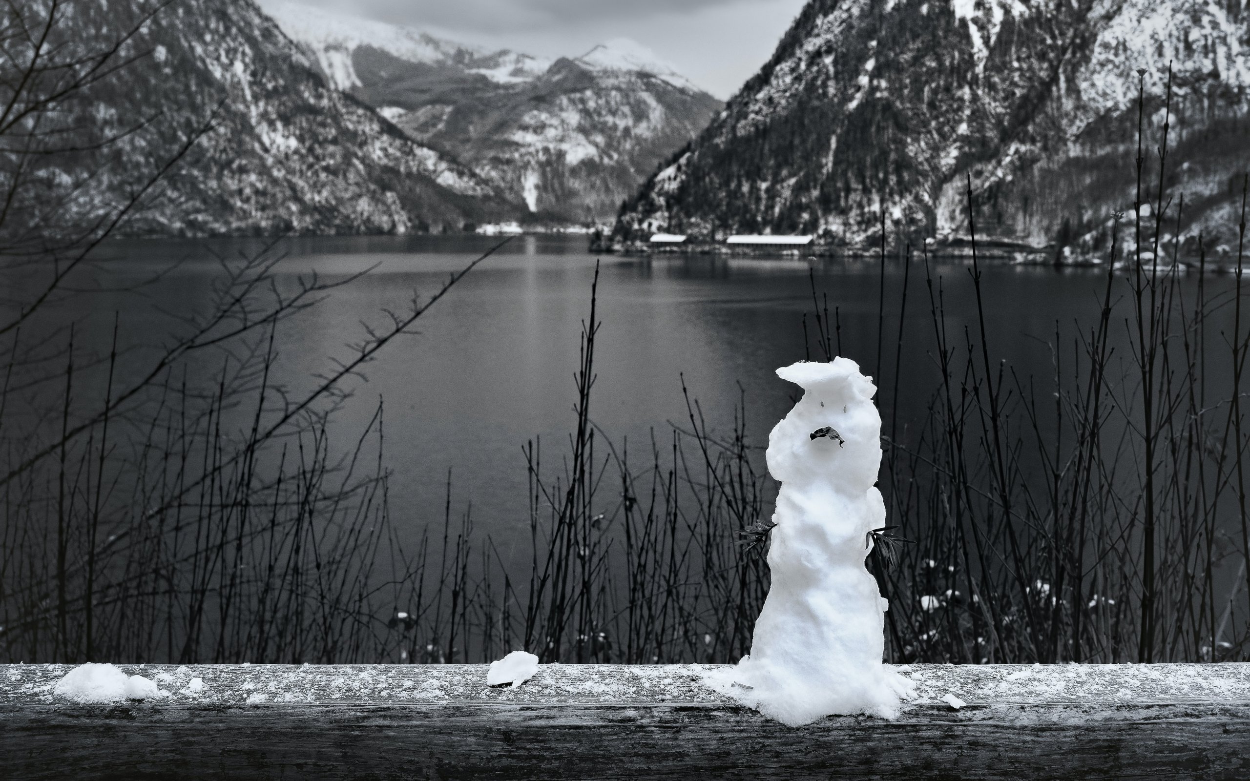 Wallpaper: mountains, lake, snowman - 2560x1600