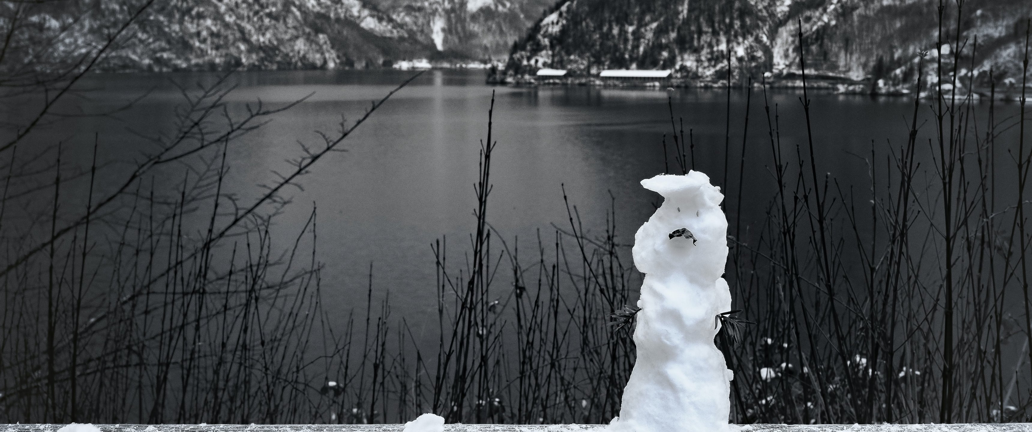 Wallpaper: mountains, lake, snowman - 3440x1440