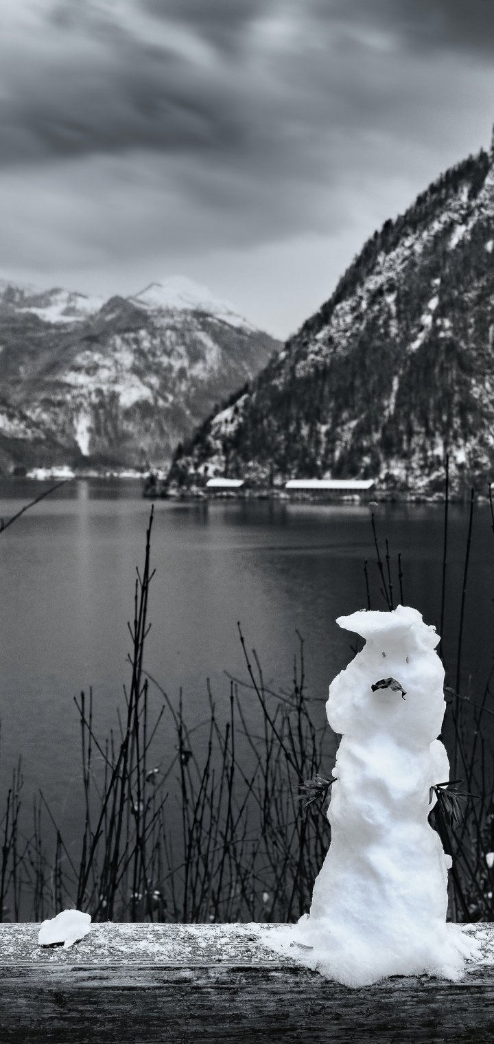 Wallpaper: mountains, lake, snowman - 720x1520