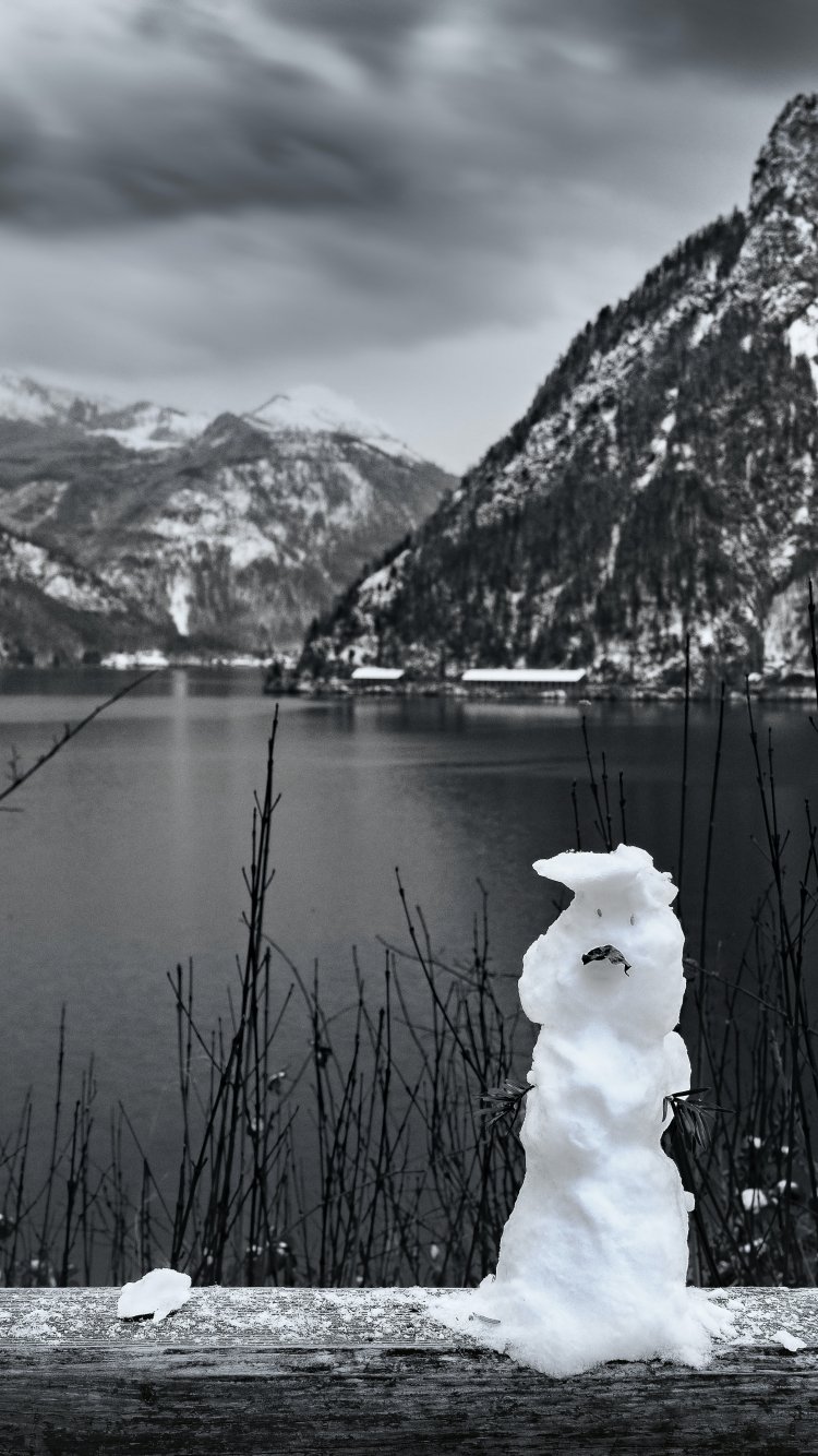 Wallpaper: mountains, lake, snowman - 750x1334