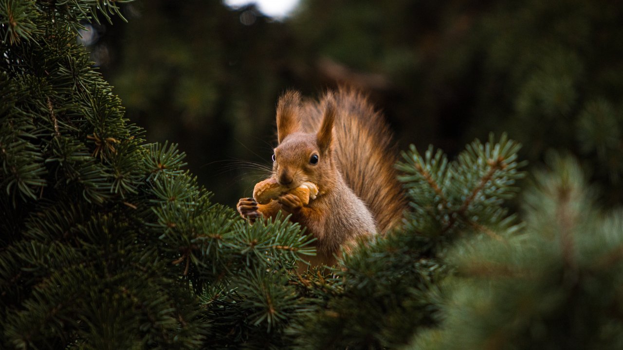 Wallpaper: squirrel, redhead, spruce - 1280x720