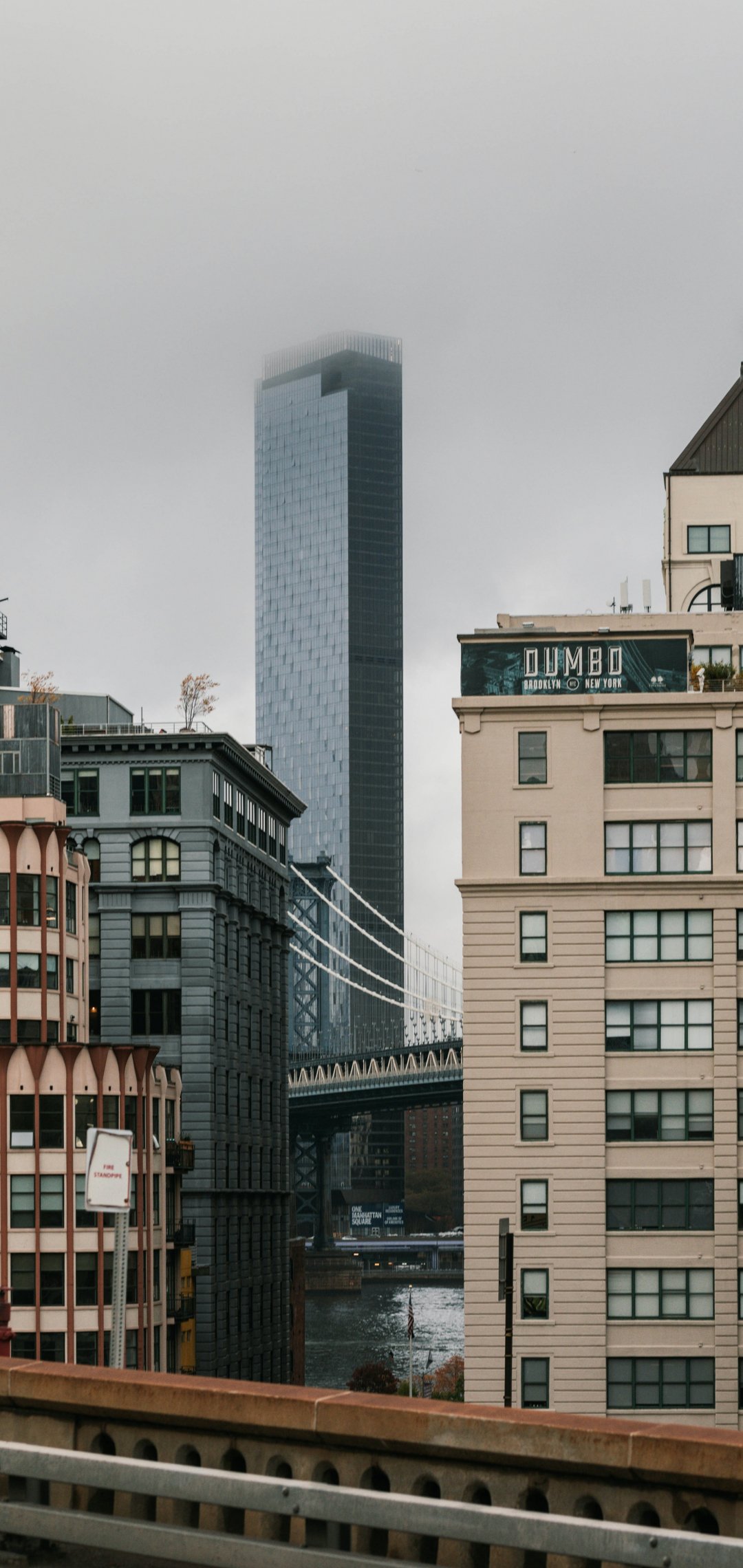 Wallpaper: Dambo, Brooklyn, New York, USA Dumbo Brooklyn new United States of America street photography Dumbo Brooklyn foggy real estate description Dumbo bridge fog architectural Manhattan bridge skyscraper city - 1080x2280