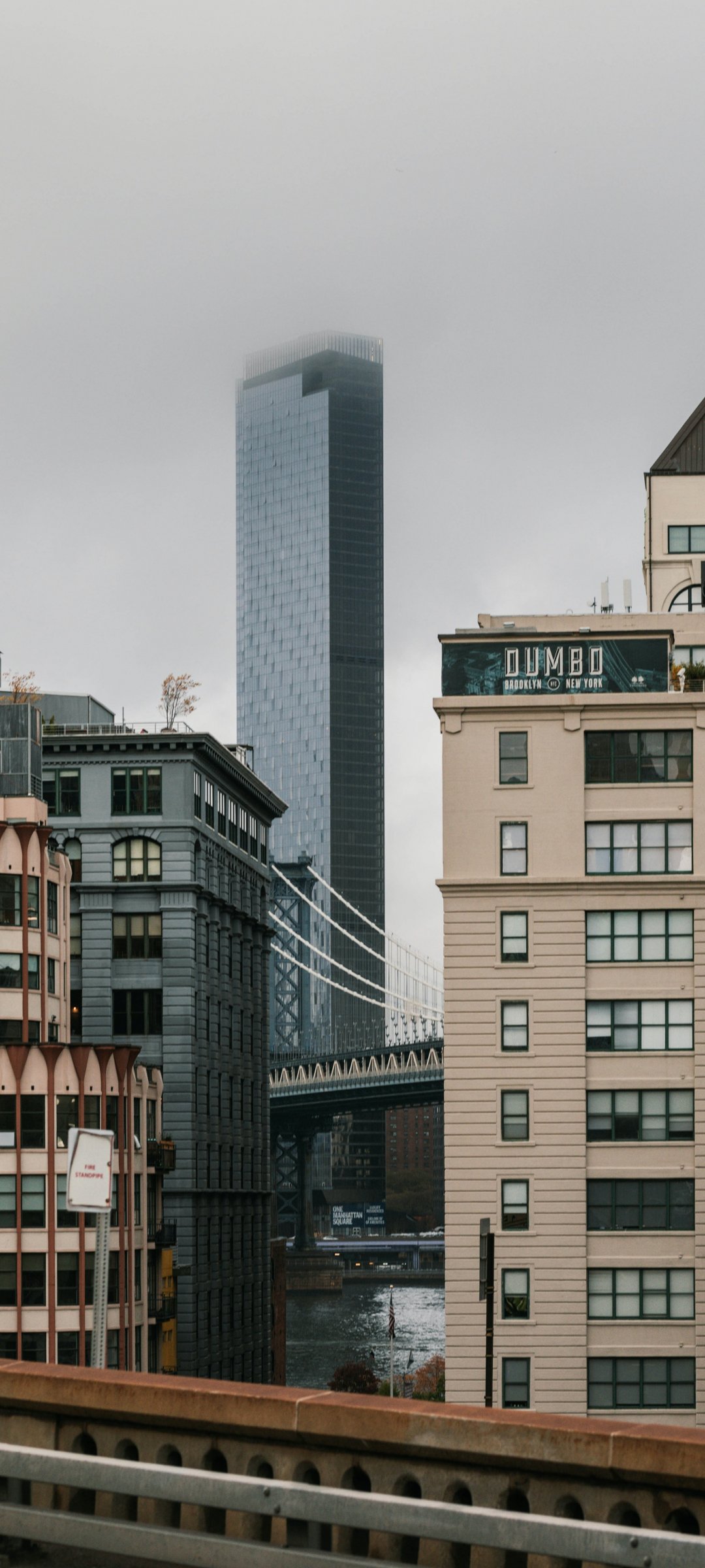 Wallpaper: Dambo, Brooklyn, New York, USA Dumbo Brooklyn new United States of America street photography Dumbo Brooklyn foggy real estate description Dumbo bridge fog architectural Manhattan bridge skyscraper city - 1080x2400