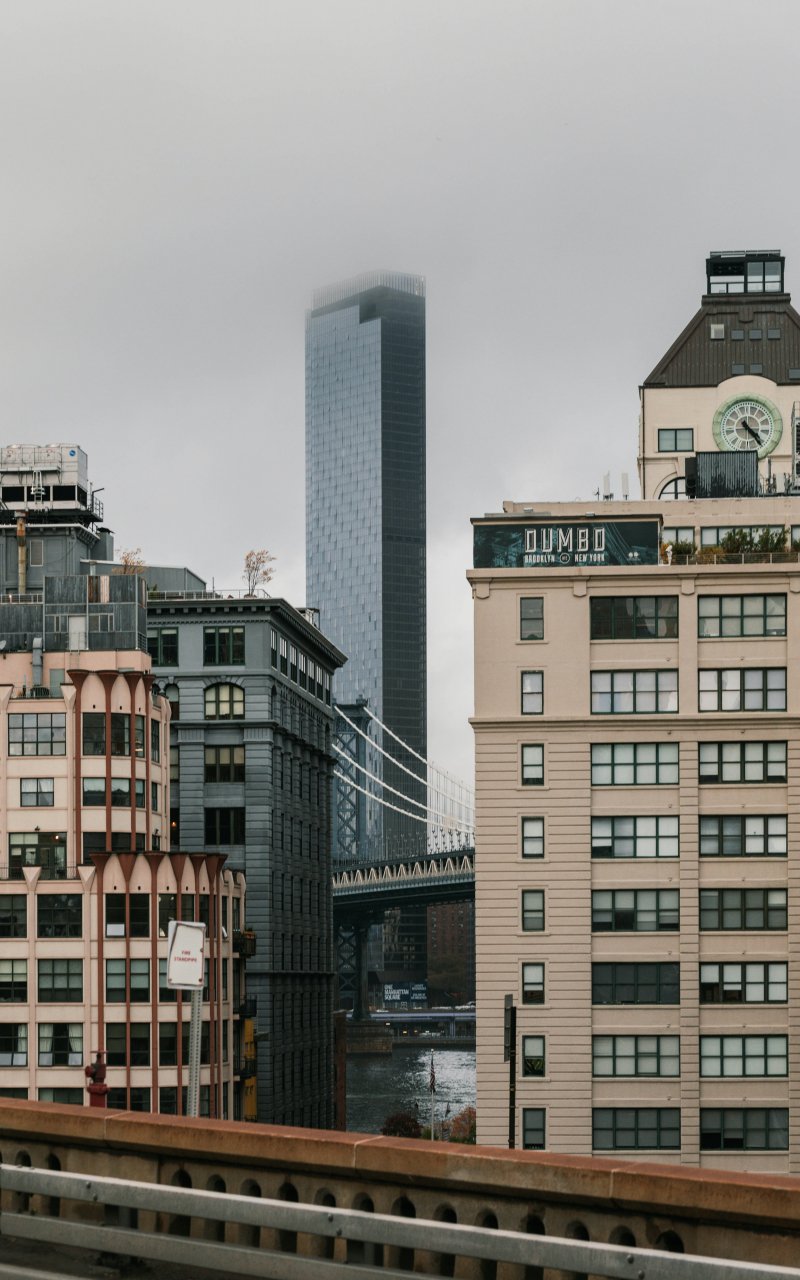 Wallpaper: Dambo, Brooklyn, New York, USA Dumbo Brooklyn new United States of America street photography Dumbo Brooklyn foggy real estate description Dumbo bridge fog architectural Manhattan bridge skyscraper city - 800x1280