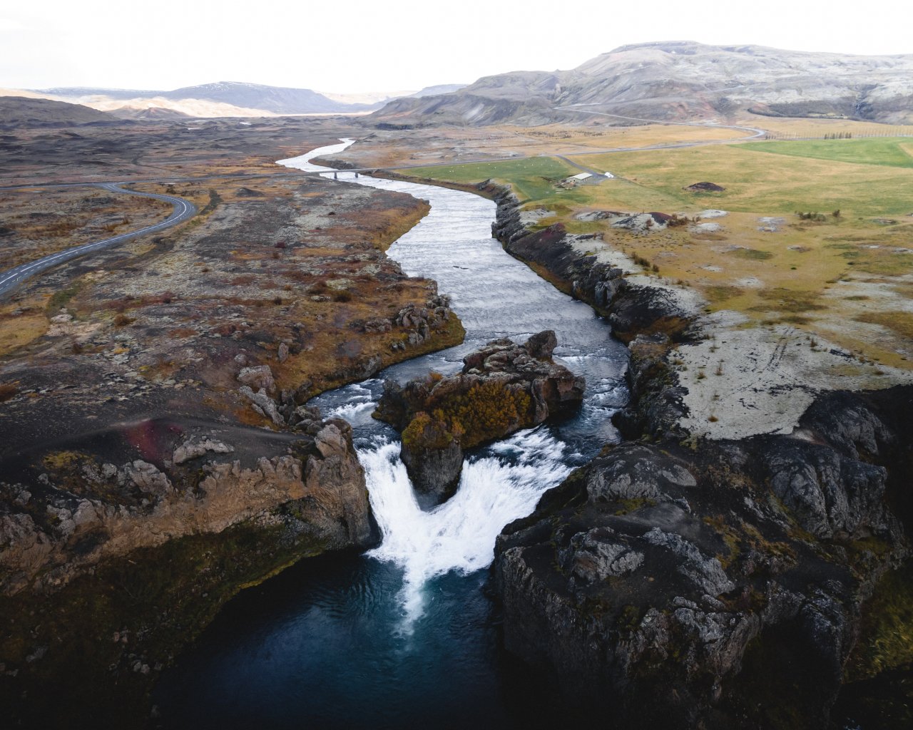 Wallpaper: river, waterfall, road, drone view - 1280x1024