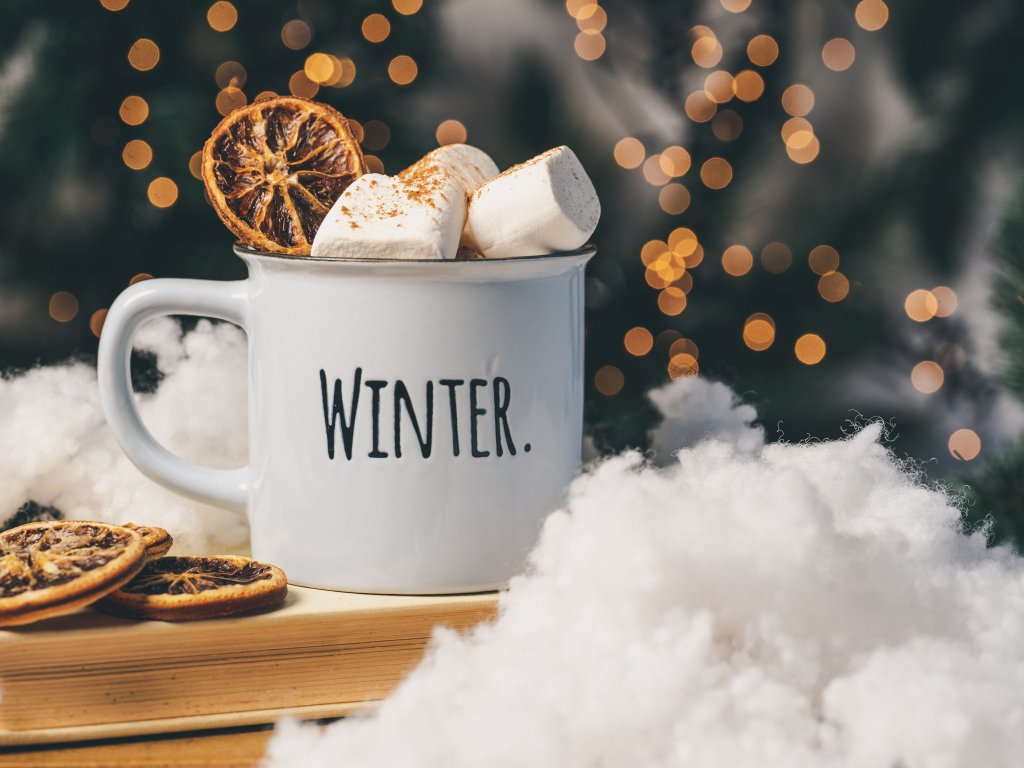 Wallpaper: winter, marshmallows, mug, cocoa, cover, lights - 1024x768
