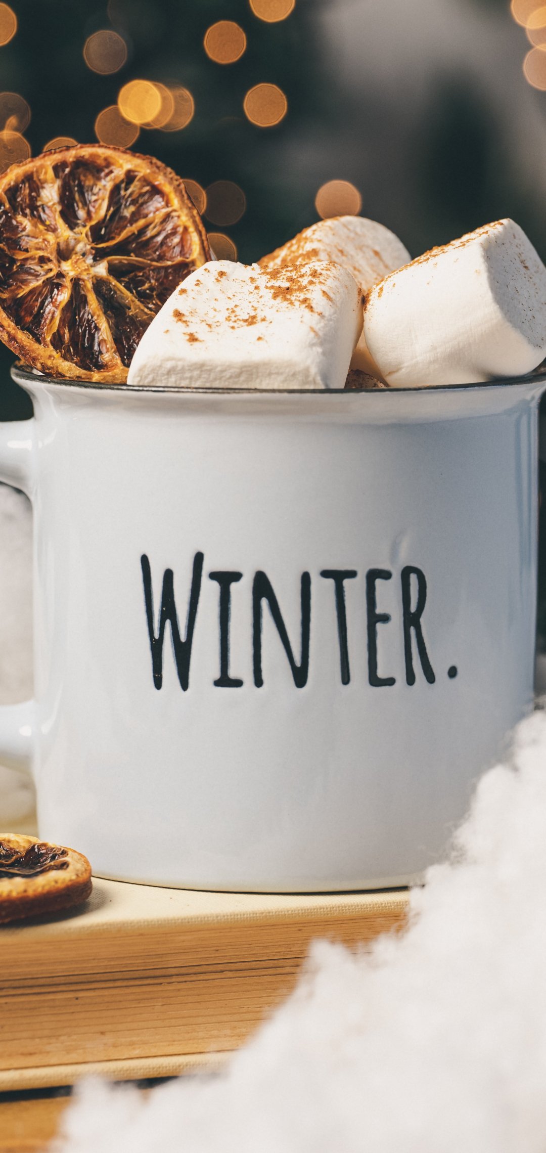 Wallpaper: winter, marshmallows, mug, cocoa, cover, lights - 1080x2280