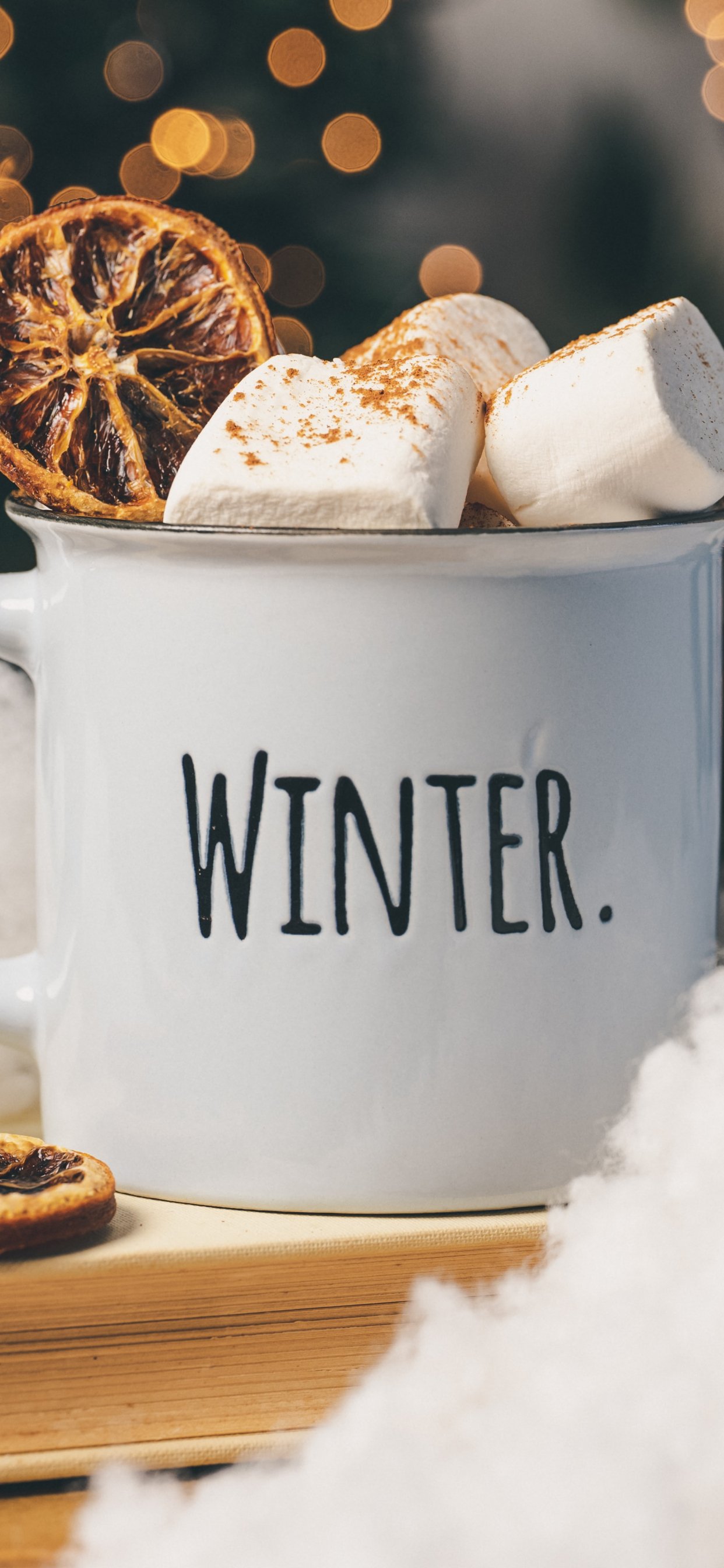Wallpaper: winter, marshmallows, mug, cocoa, cover, lights - 1242x2688