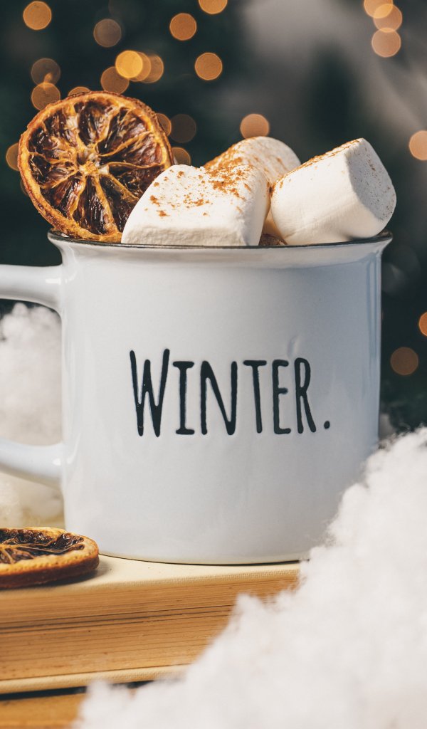 Wallpaper: winter, marshmallows, mug, cocoa, cover, lights - 600x1024