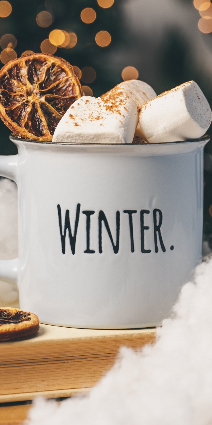 Wallpaper: winter, marshmallows, mug, cocoa, cover, lights - 720x1440