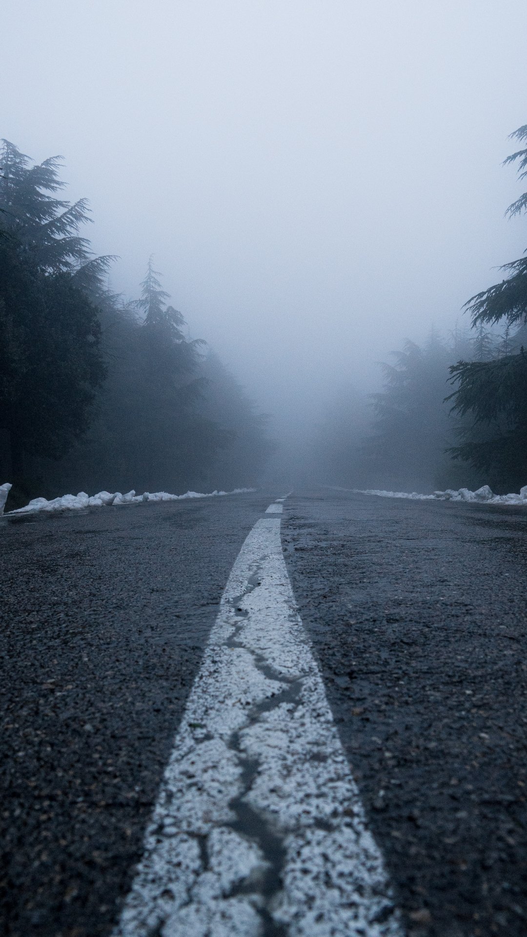 Wallpaper: road, fog, forest, snow - 1080x1920