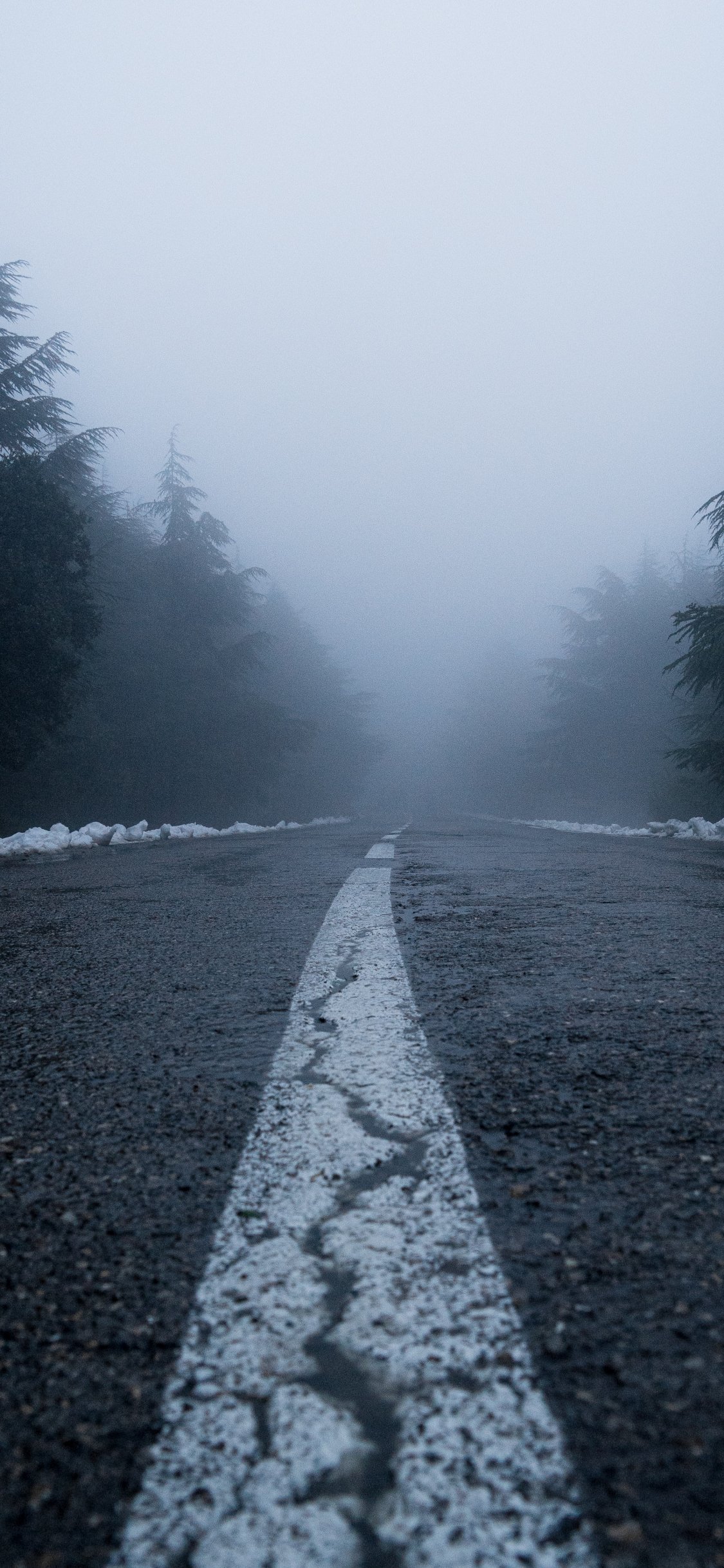 Wallpaper: road, fog, forest, snow - 1125x2436