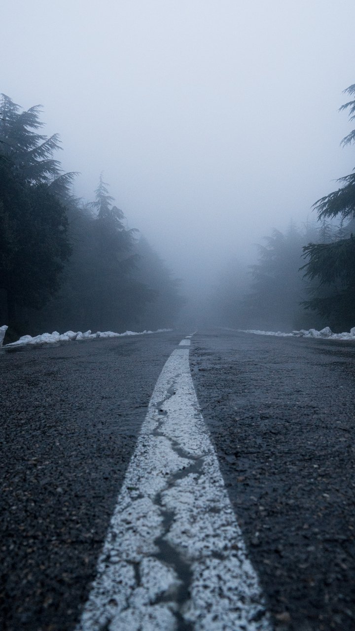 Wallpaper: road, fog, forest, snow - 720x1280