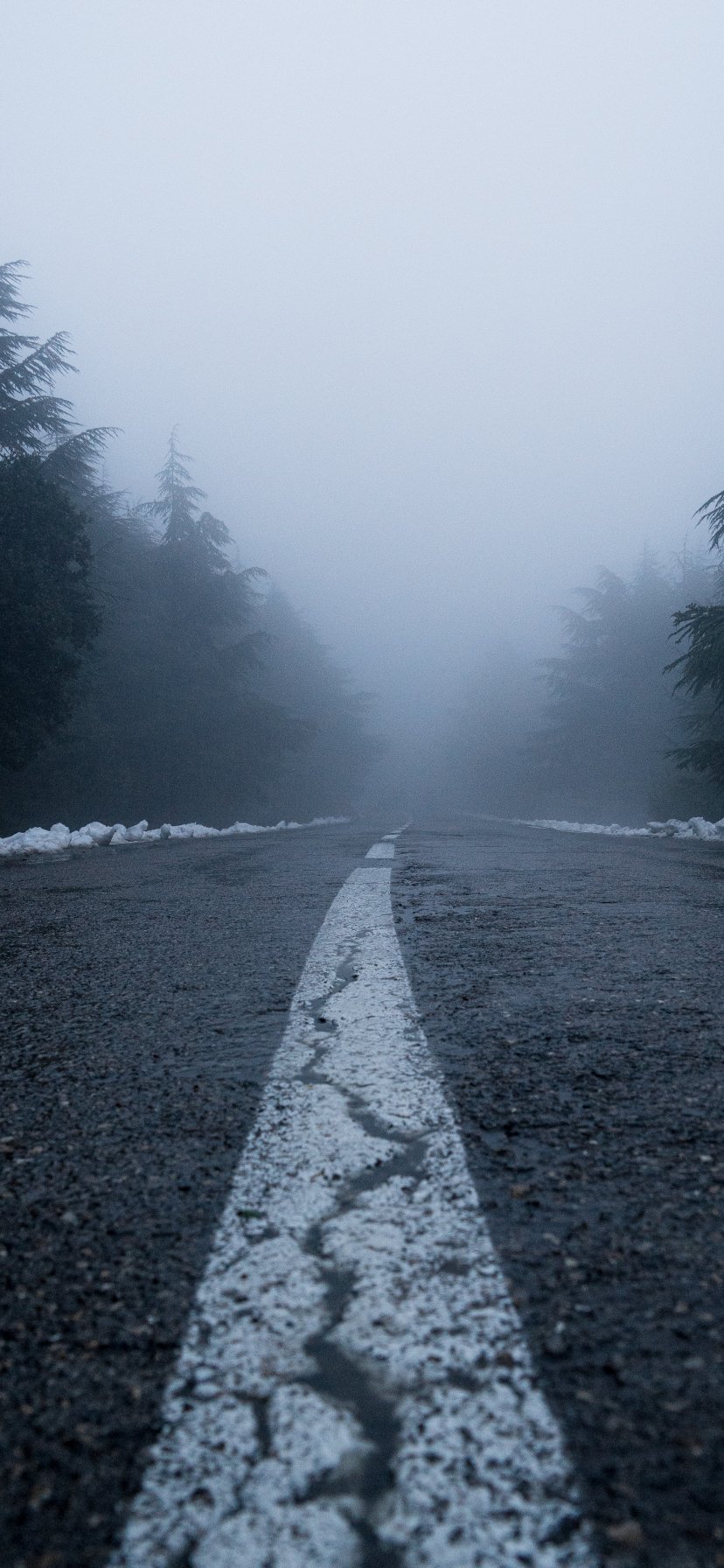 Wallpaper: road, fog, forest, snow - 828x1792
