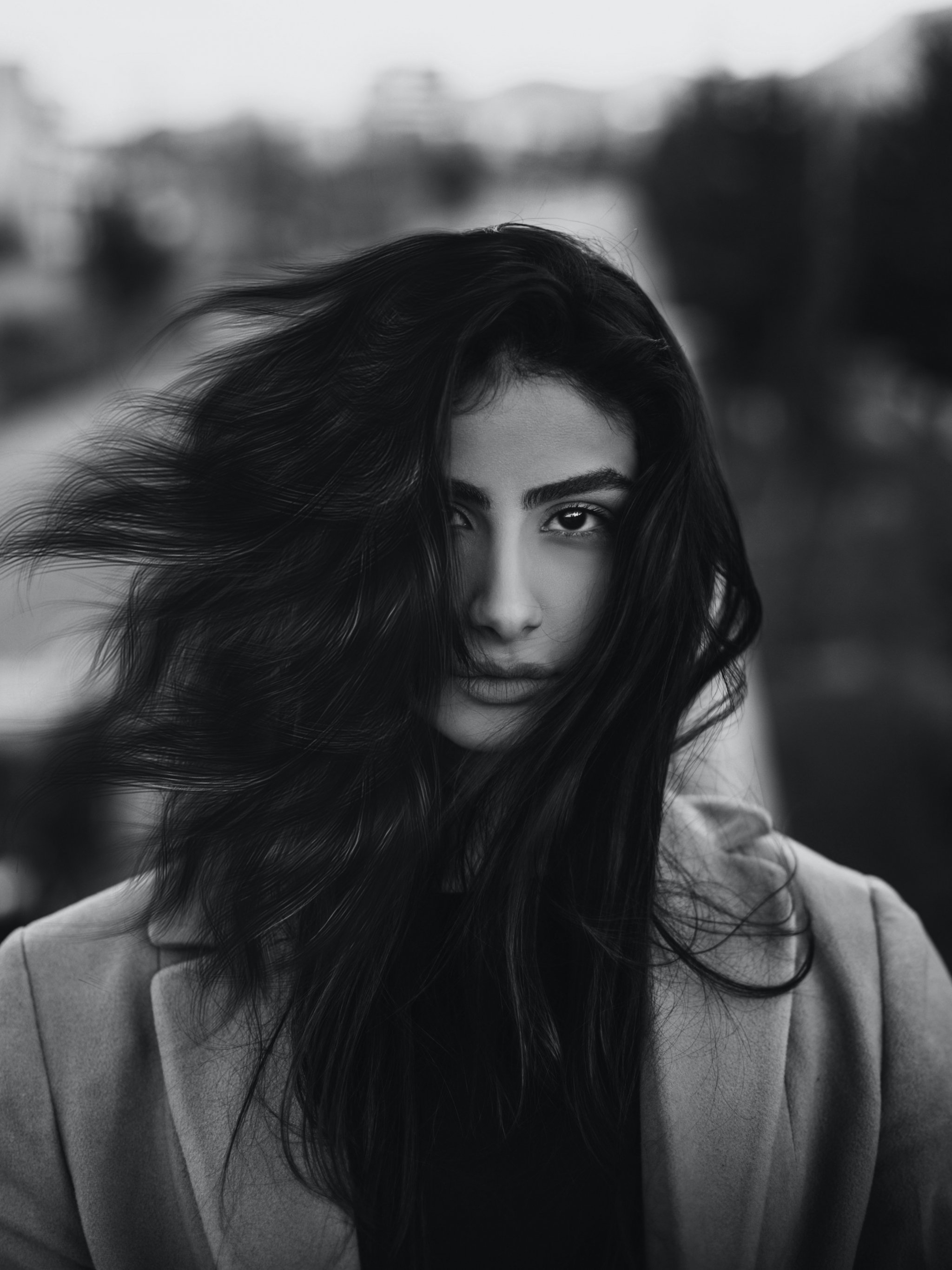 Wallpaper: girl, portrait, black and white photo, wind - 2048x2732