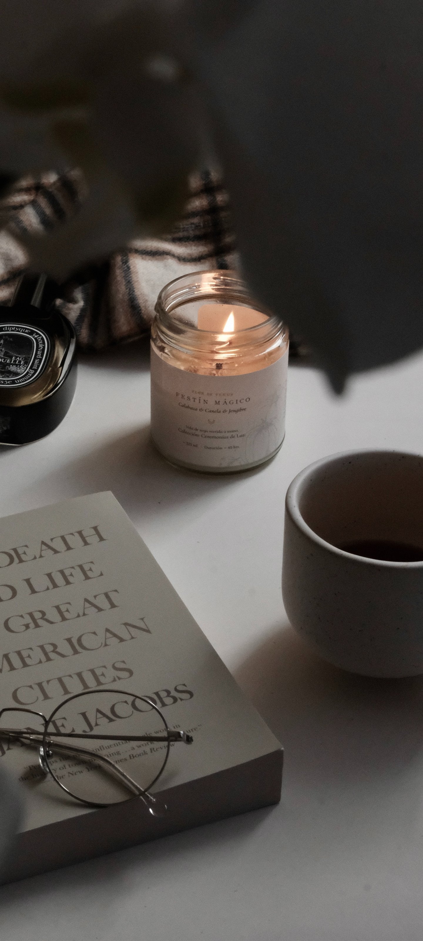 Wallpaper: candle, book, glasses, aesthetics, minimalism - 1440x3200