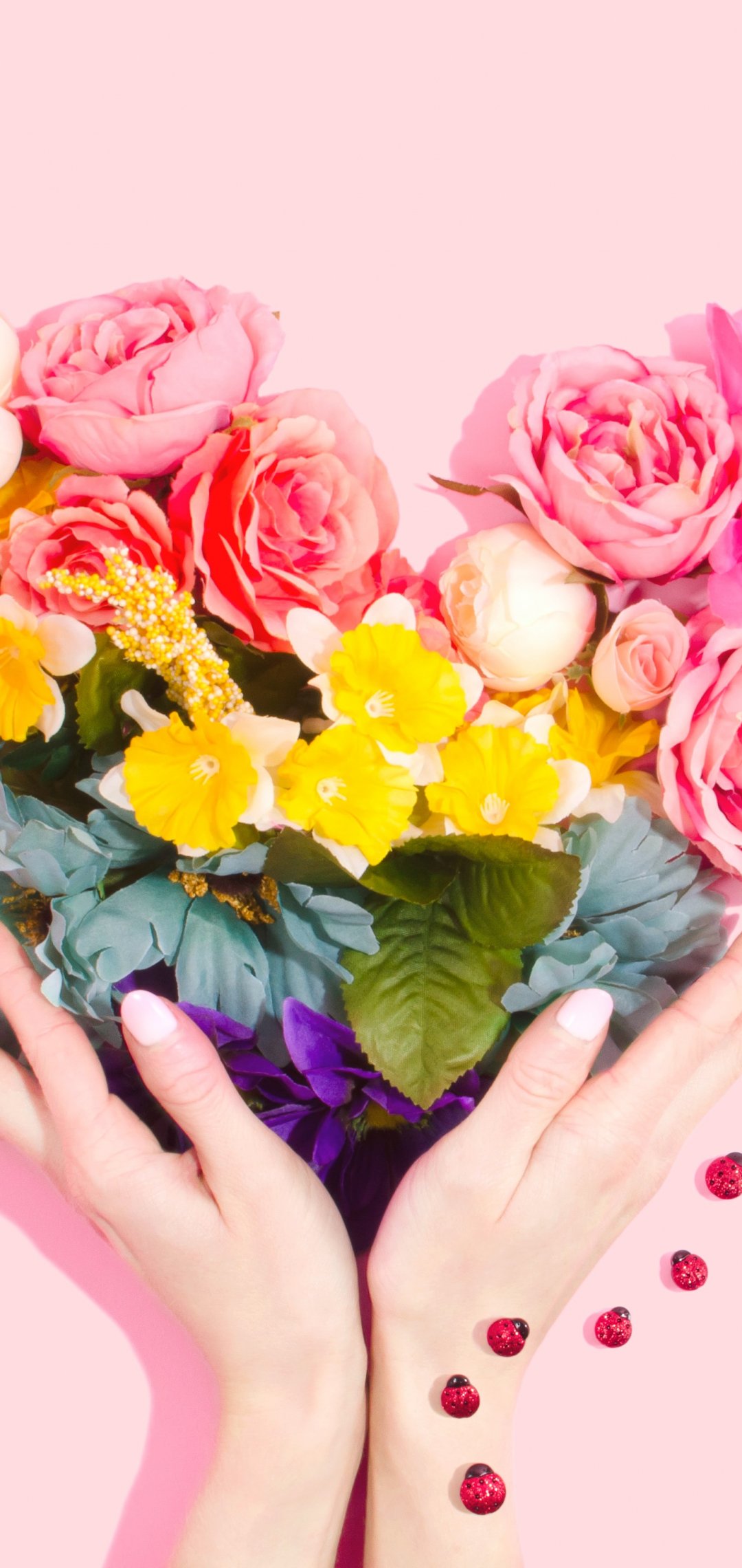 Wallpaper: flowers, hands, heart, pink background - 1080x2280