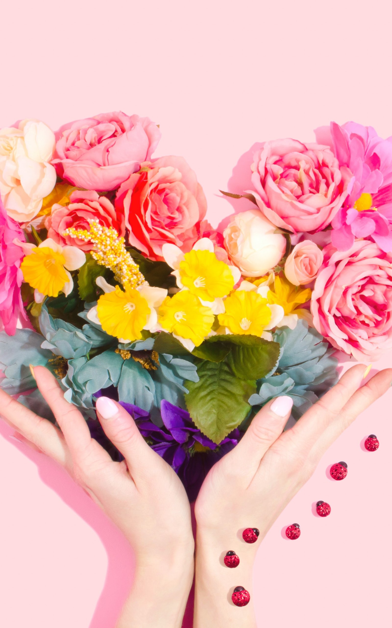 Wallpaper: flowers, hands, heart, pink background - 1600x2560