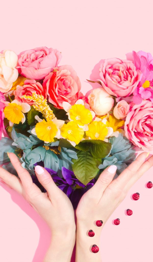 Wallpaper: flowers, hands, heart, pink background - 600x1024