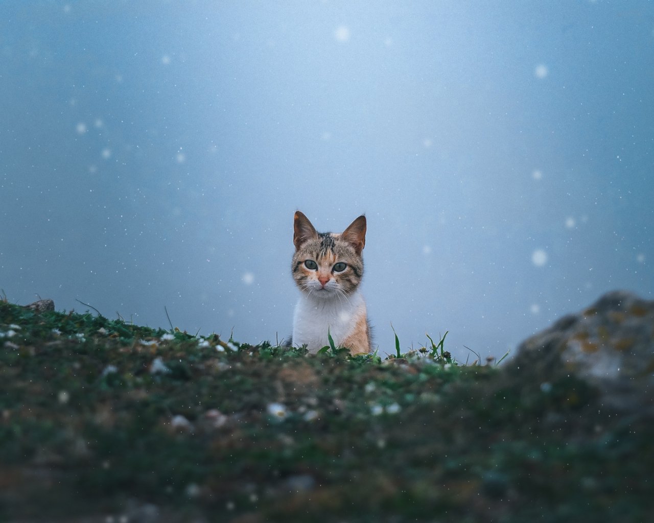 Wallpaper: cat, snow, grass - 1280x1024