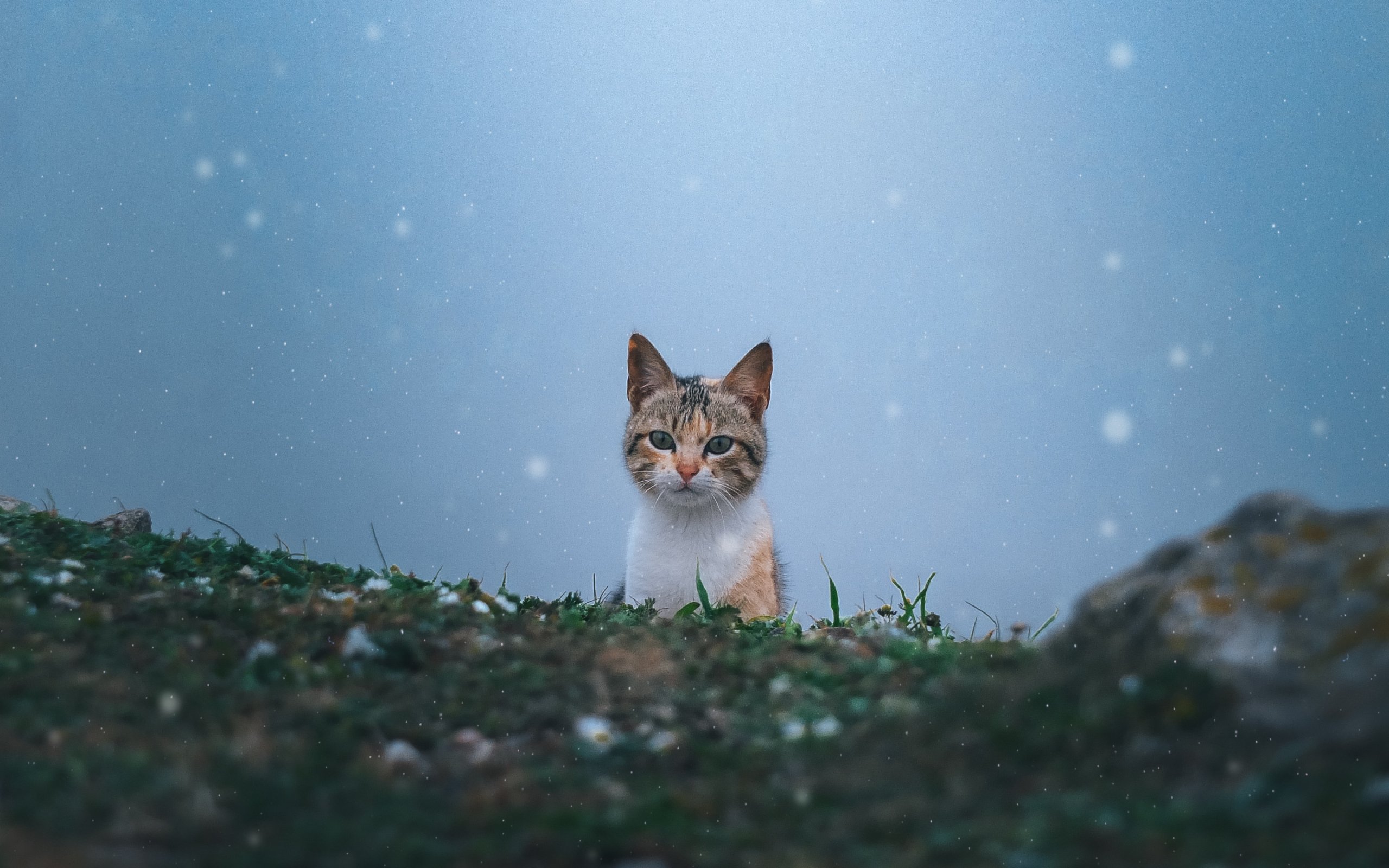 Wallpaper: cat, snow, grass - 2560x1600