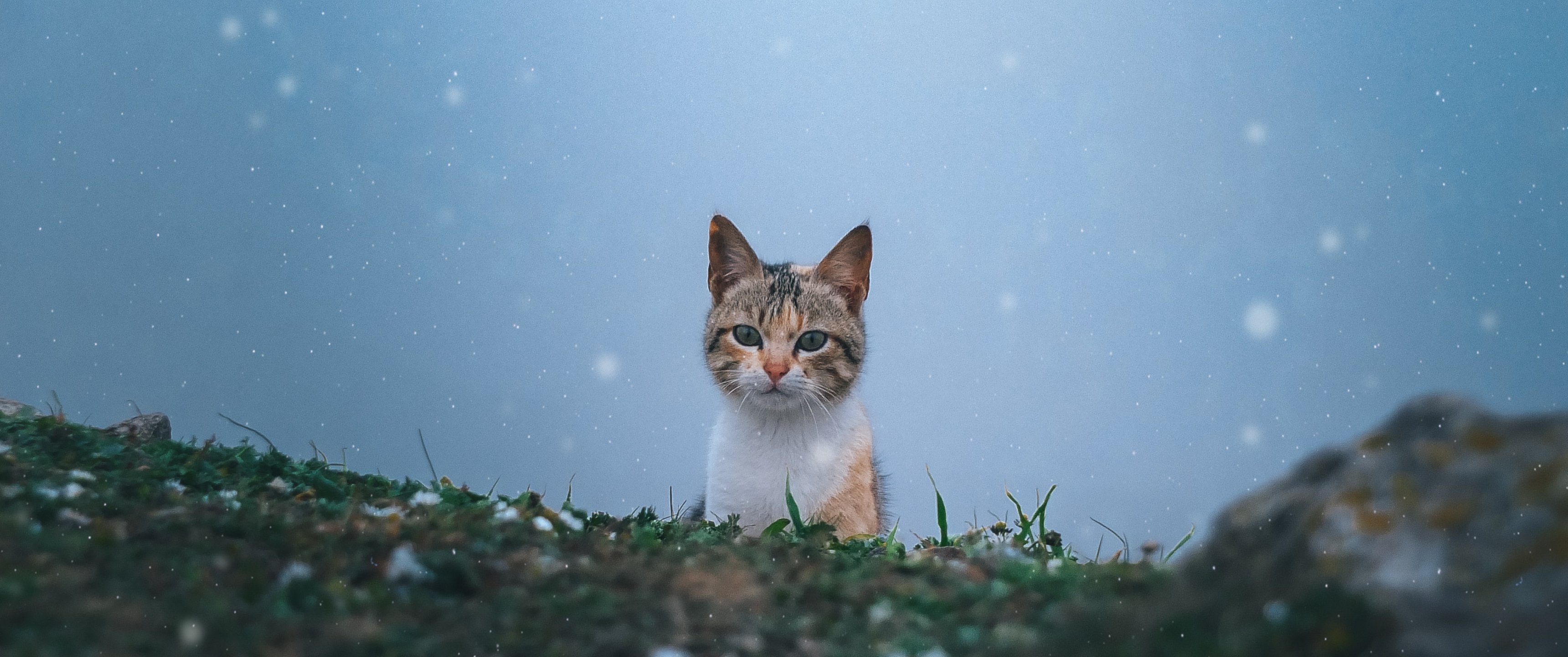 Wallpaper: cat, snow, grass - 3440x1440